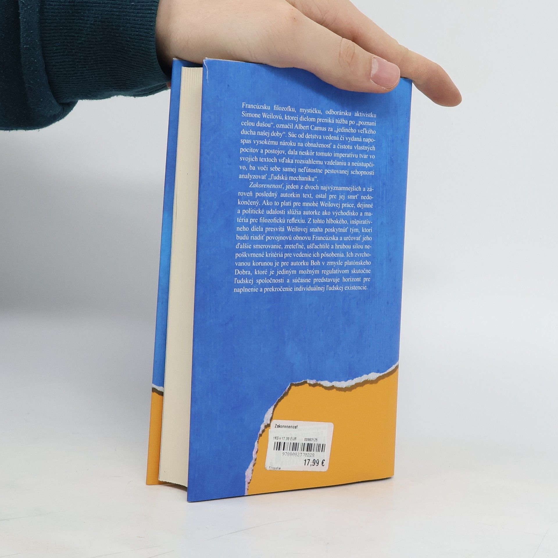 Francúzsku filozofku, mystičku, odborársku aktivistku Simone Weilovú (1909-1943), ktorej celým dielom preniká túžba po „poznaní celou dušou“, označil Albert Camus za „jediného veľkého ducha našej doby“. Filozofia podľa nej „nenapreduje, nevyvíja sa“, to, čo je v nej najpodstatnejšie, je jednota a totožnosť skutočnej múdrosti naprieč časom, čiže dotyk s večnosťou. Preto Weilová môže odmietnuť konceptuálne systematizácie, v ktorých sa skrýva totalitárna a napokon celkom imaginárna ambícia racionality na obsiahnutie celej Skutočnosti. Zakorenenosť, jeden z dvoch najvýznamnejších a zároveň posledný autorkin text, ostal pre jej smrť nedokončený. Ako pri mnohých Weilovej textoch dejinné a politické udalosti slúžia autorke ako východisko a matéria pre filozofickú reflexiu. Z tohto hlbokého, inšpiratívneho diela presvitá Weilovej snaha poskytnúť tým, ktorí budú riadiť povojnovú obnovu Francúzska a určovať jeho ďalšie smerovanie, zreteľné, ušľachtilé a hrubou silou nepoškvrnené kritériá pre vedenie ich pôsobenia. Ich zvrchovanou korunou je pre autorku Boh v zmysle platónskeho Dobra, ktoré jediné môže byť hlavným regulatívom skutočne ľudskej spoločnosti a súčasne predstavuje horizont pre naplnenie a prekročenie individuálnej ľudskej existencie.