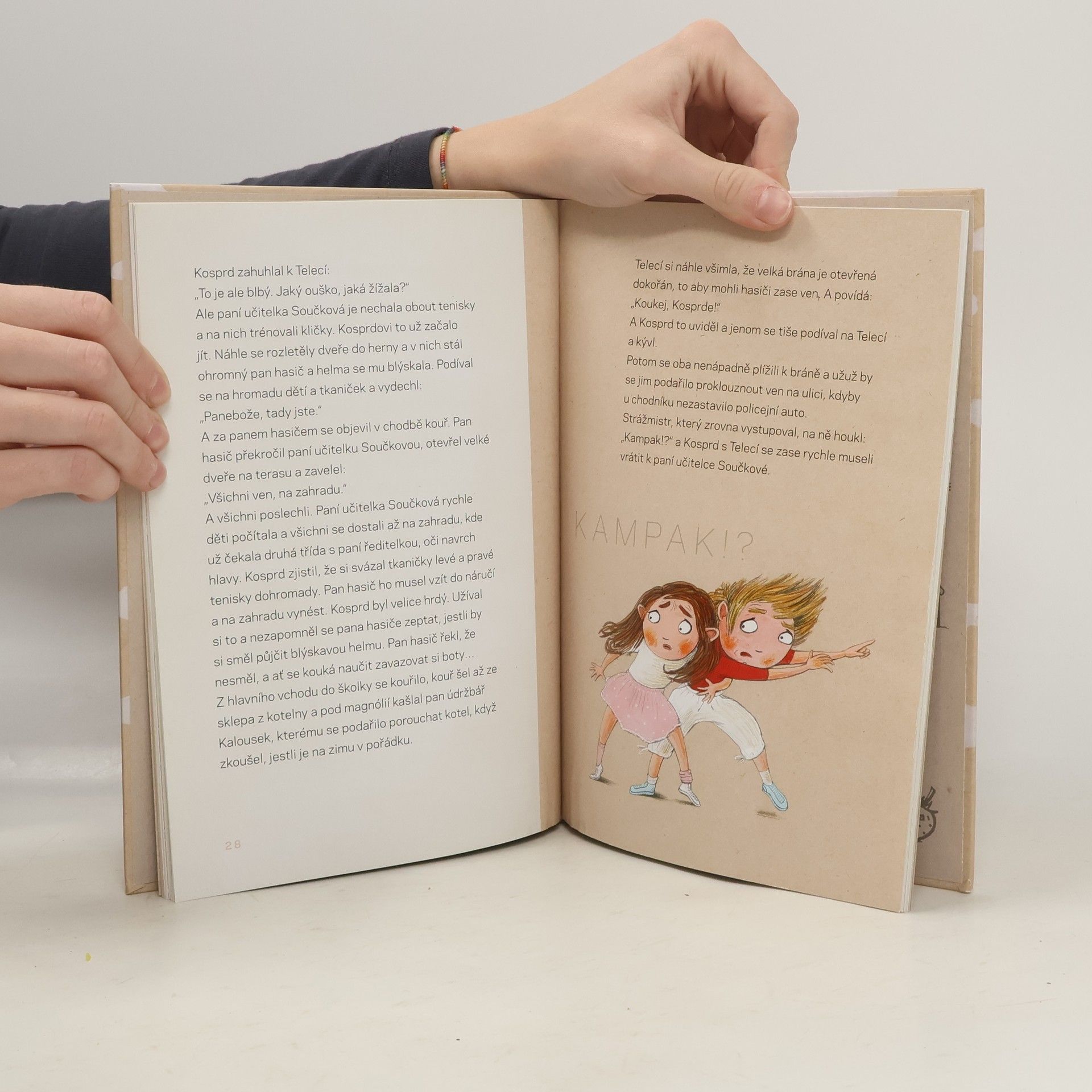 Malý Kosprd, hrdina naší knížky, miluje tatínkovu dílnu a moc rád tátovi pomáhá při výrobě vzducholodi, ale jednoho dne se rodiče rozhodnou, že jejich syn musí začít chodit do školky. Toto rozhodnutí se mu nelíbí, a velmi hlasitě protestuje – při příchodu do školky. Téměř každý rodič, který vedl poprvé své dítko do školky, ví, o čem je řeč. A také spousta dětí zná takovou situaci. V našem příběhu však malý Kosprd má velké štěstí, protože hned první den ve školce potká báječnou kamarádku s fantazií a zajímavými nápady, malou Telecí… Vyprávění zachycuje každodenní momenty, které se mohou přihodit v kterékoliv mateřské školce, a velmi vtipně i s nadsázkou popisuje život předškoláků a jejich nápady, nad nimiž se dospělí nestačí divit. Přátelství Kosprda a Telecí, jejich „vejšplechty“ i dobrodružství jsou zachyceny věrohodně a vtipně.