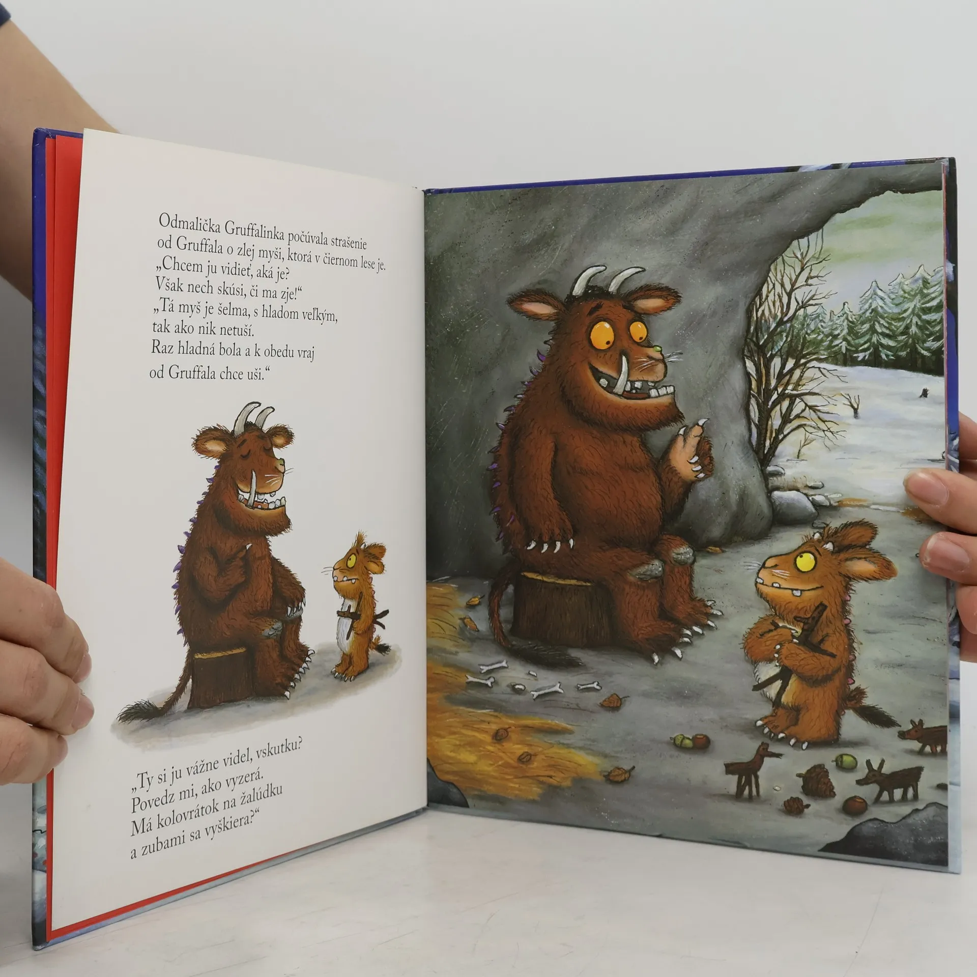V jednu chladnú zimnú noc, keď Gruffalo spal v jaskyni, Gruffalinka tíško vyšla, k lesu krokmi ľahkými. Neposlúchla varovanie, nezostala v pokoji, po malých krôčkoch k lesu tiahne a ničoho sa nebojí. „Čo je to tu za stopu?“, Gruffalinka tíško háda. Do lesa prišla hľadať myš, len nevie, ako sa myš hľadá. Otecko Gruffalo spomína na dobrodružstvo z Čierneho lesa, zatiaľ čo jeho neveľká dcérka Gruffalinka sa už nevie dočkať chvíle, kedy tajomstvo preskúma sama. K prekvapeniam odhodlaná, do lesa mieri celkom sama. Pokračovanie najčítanejšej detskej obrázkovej knižky na svete. Detský príbeh anglickej autorky Julie Donaldsonovej s malebnými a obľúbenými ilustráciami Axela Schefflera. Rozprávka vo veršoch, určená ako prvé čítanie pre začínajúcich čitateľov je krásnym dobrodružstvom prvých písmeniek, veselých obrázkov a spoločného čítania s rodičmi, na ktoré dlho nezabudnete.