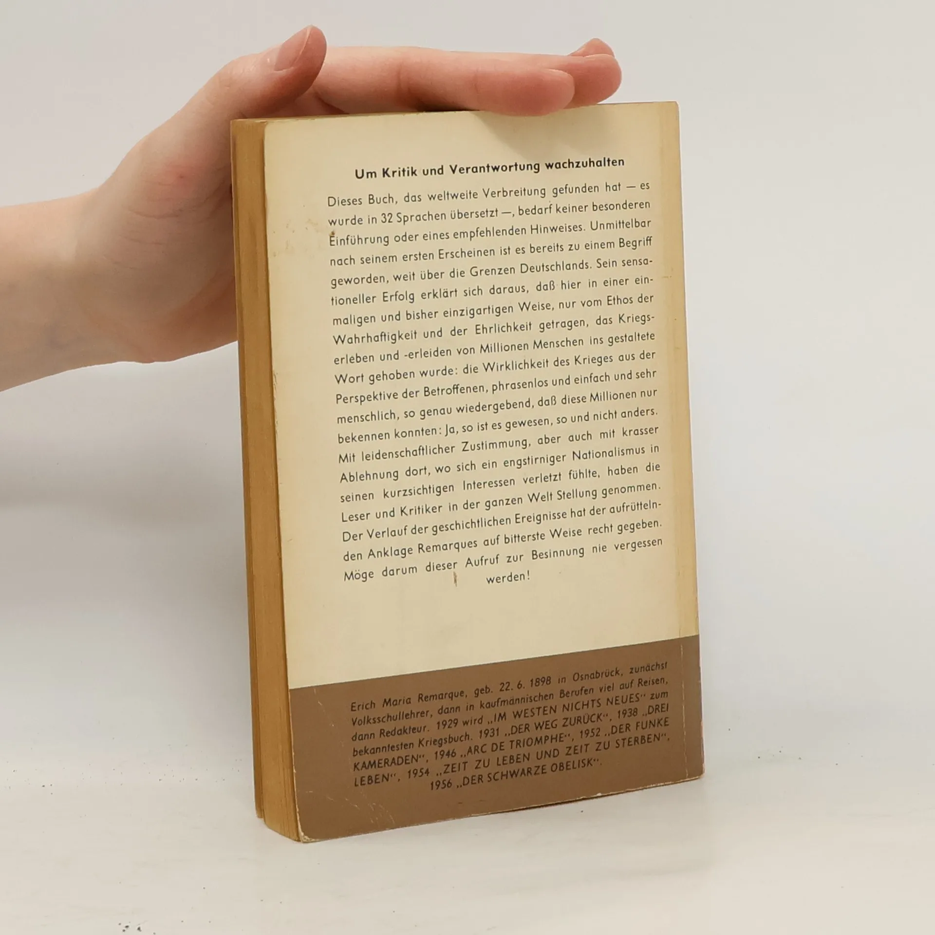 Der Weltbestseller der Anti-Kriegsliteratur»Man hat den Menschen gesagt: Du darfst nicht töten. Aber man hat ihnen auch gesagt: Du mußt gut zielen, damit Du triffst.«Erich Maria Remarque Erich Maria Remarques Abrechnung mit dem Krieg machte ihn 1929 schlagartig bekannt. »Im Westen nichts Neues« wurde eines der sensationellsten Erfolgsbücher der deutschen Literatur überhaupt. 1933 verboten, erlebte das Buch nach dem Zweiten Weltkrieg eine Renaissance, die bis heute ungebrochen anhält. »Es ist ein in seiner Art vollendetes Buch: klar und einfach, dramatisch und anschaulich, rührend und erschütternd. Es ist ehrlich und trotzdem fragwürdig. Als Remarque 1970 starb, schrieb ich, Deutschland brauche immer noch sein Buch Im Westen nichts Neues. Ich glaube, dies ist noch immer so.«Marcel Reich-Ranicki in der Frankfurter Allgemeinen Sonntagszeitung