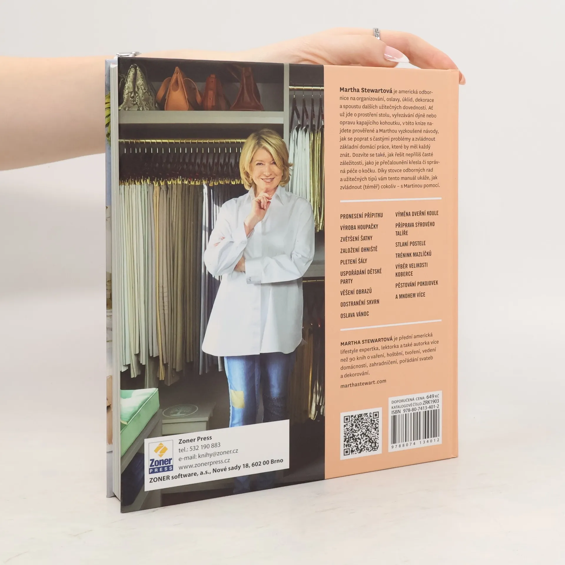 Jak zvládnout (téměř) cokoli. „Stále teď slýcháme, že jsme příliš zaneprázdnění učit se něco nového – že do svého rozvrhu nedokážeme napasovat lekci zahradničení, šití nebo seminář malování. S tím důrazně nesouhlasím! Položte telefon a vezměte si pletací jehlice, zahradnickou lopatku nebo dokonce šroubovák – a vyrábějte, pěstujte, opravujte. Budete rádi, že jste to udělali.“ Martha Stewartová je americká odbornice na organizování, oslavy, úklid, dekorace a spoustu dalších užitečných dovedností. Ať už jde o prostření stolu, vyřezávání dýně nebo opravu kapajícího kohoutku, v této knize najdete prověřené a Marthou vyzkoušené návody, jak se poprat s častými problémy a zvládnout základní domácí práce, které by měl každý znát. Dozvíte se také, jak řešit nepříliš časté záležitosti, jako je přečalounění křesla či správná péče o kočku. Díky stovce odborných rad a užitečných tipů vám tento manuál ukáže, jak zvládnout (téměř) cokoliv – s Martinou pomocí. V knize najdete například rady a tipy ohledně pronesení přípitku, výroby houpačky, zvětšení šatny, založení ohniště, pletení šály, uspořádání dětské párty, věšení obrazů, odstranění skvrn, oslavy Vánoc, výměny dveřní koule, přípravy sýrového talíře, stlaní postele, tréninku mazlíčků, výběru velikosti koberce, pěstování pokojovek a mnohem více