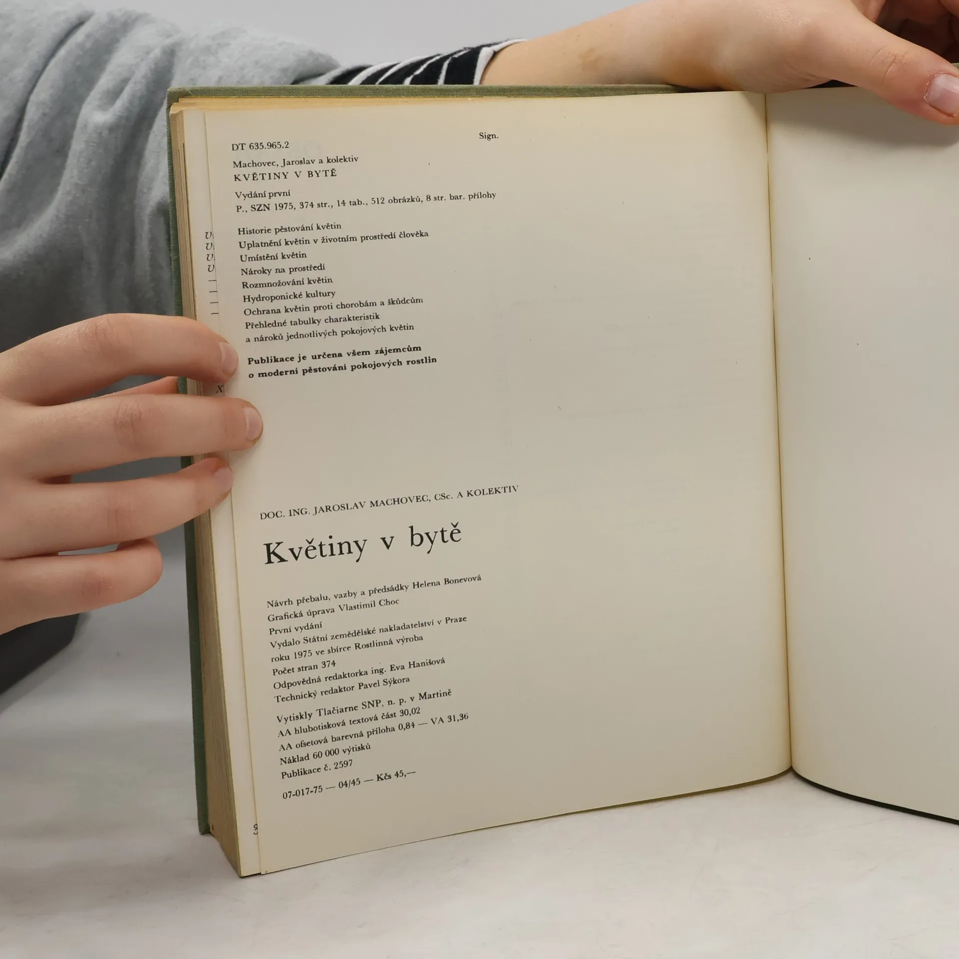Vše o pěstování květin v bytě. Světlo, teplota, vlhkost, zemina, výživa, rozmnožování, přesazování, choroby atd. Přehledné tabulky charakteristik a nároků jednotlivých pokojových květin. Publikace je určena všem zájemcům o moderní pěstování pokojových rostlin. Vedoucí autorského kolektivu : Ing. Jaroslav Machovec. 374 stran, 14 tabulek, 512 obrázků, 8 stran barevné přílohy.