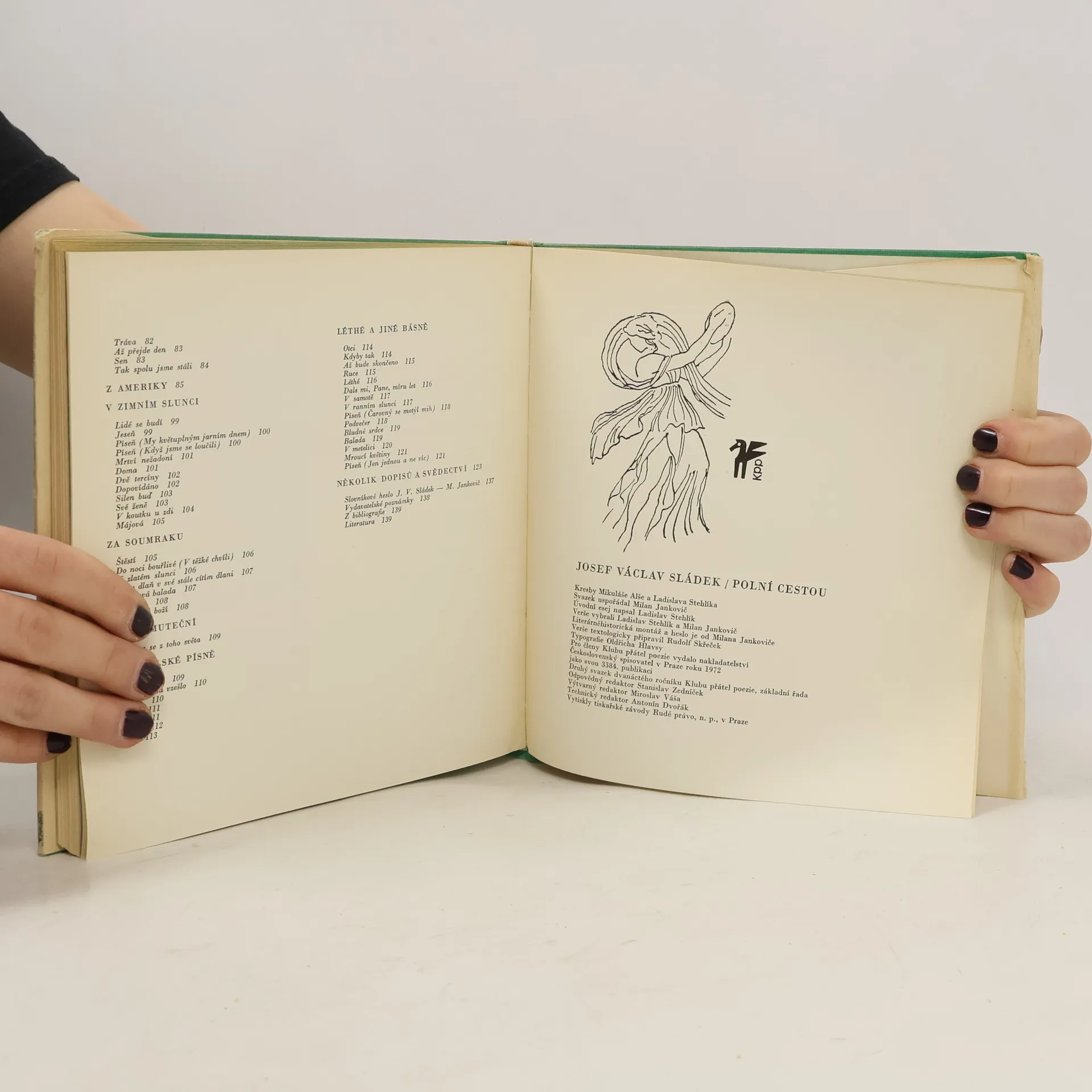 tvorby, kromě sbírek veršů pro děti, doplněným literárněhistorickou montáží z jeho korespondence a z úryvků kritických projevů i ze vzpomínek jeho přátel. Básnické texty byly převážně převzaty ze Spisů básnických J.V. Sládka, uspořádaných autorem a vydaných nakladatelstvím J. Otty v roce 1907. Kniha představuje výbor reprezentativně výrazného básníka prosté písňové formy, lyrické symbolizace a výrazové zkratky. Svazek uspořádal Milan Jankovič. Část nákladu vydána s mikrodeskou s recitacemi řady básní.