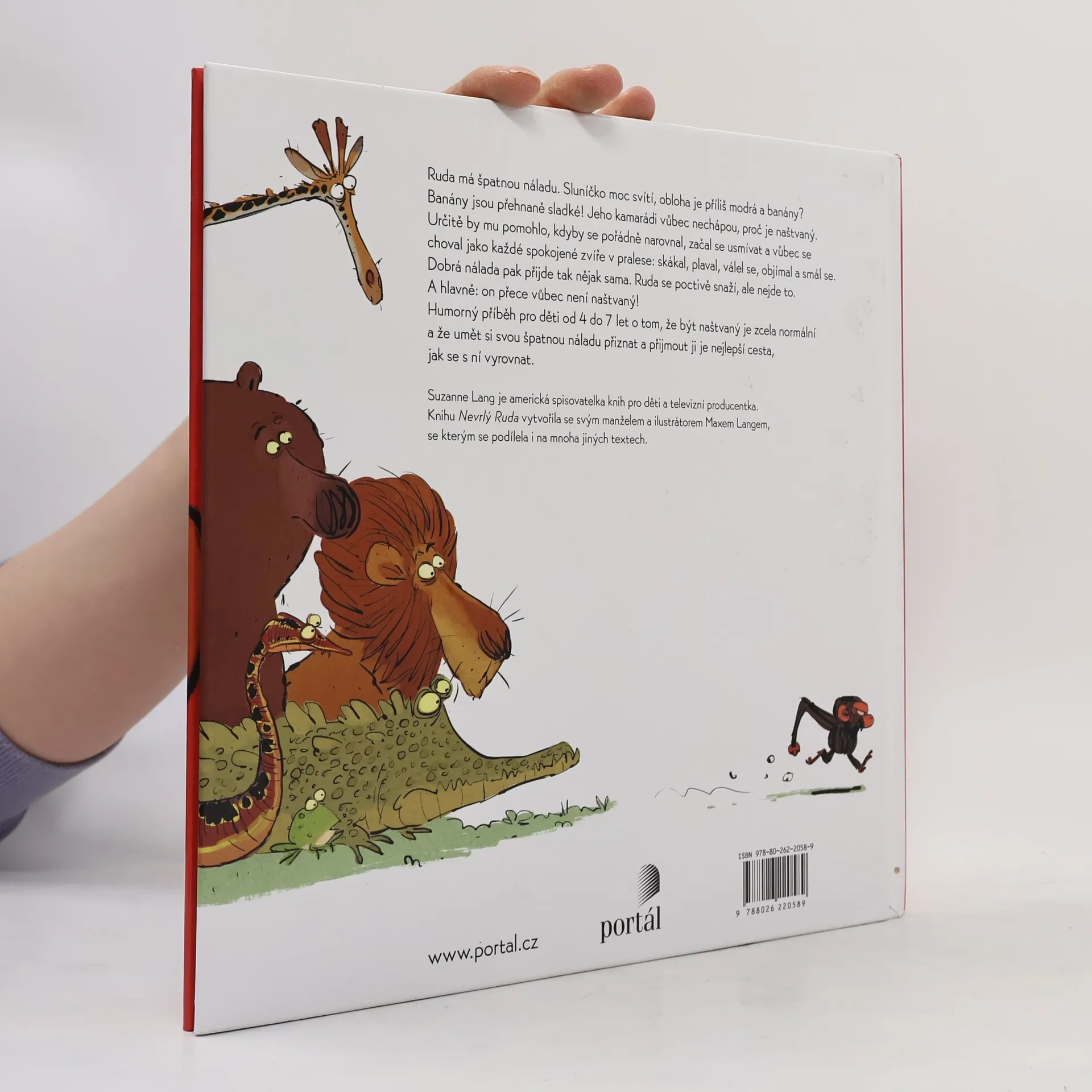 Tvrďák Ruda má špatnou náladu. Sluníčko moc svítí, obloha je příliš modrá a banány? Banány jsou přehnaně sladké!Jeho kamarádi vůbec nechápou, proč je naštvaný. Určitě by mu pomohlo, kdyby se pořádně narovnal, začal se usmívat a vůbec se choval jako každé spokojené zvíře v pralese: skákal, plaval, válel se, objímal a smál se. Dobrá nálada přijde pak tak nějak sama. Ruda se poctivě snaží, ale nejde to. A hlavně: on přece vůbec není naštvaný!Humorný příběh pro děti od 4 do 7 let o tom, že být naštvaný je zcela normální a že umět si svou špatnou náladu přiznat a přijmout ji, je nejlepší cesta, jak se s ní vyrovnat.Kniha se dostala do první desítky bestsellerů The New York Times a na seznamu strávila 25 týdnů. Má dalších 8 pokračování.Suzanne Lang je americká spisovatelka knih pro děti a televizní producentka. Knihu Nevrlý Ruda vytvořila se svým manželem a ilustrátorem Maxem Langem, se kterým se podílela i na mnoha jiných textech.