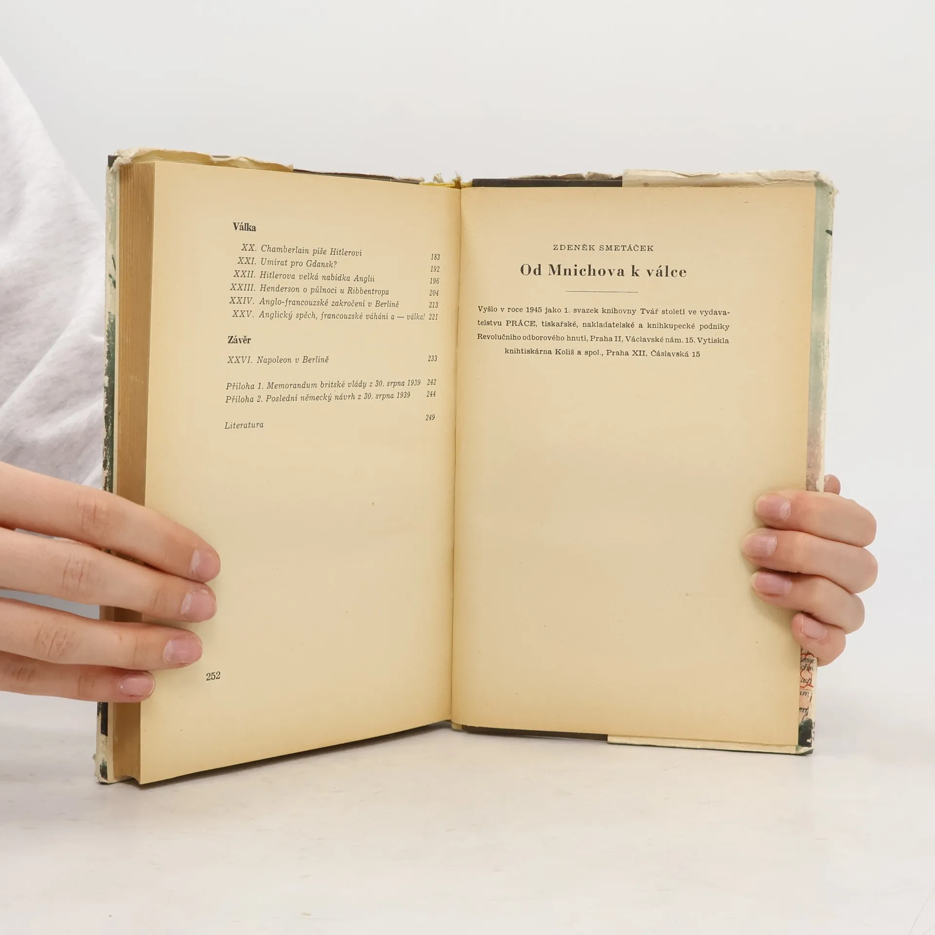 Z dějů soumračných měsíců druhé poloviny roku 1938 a roku 1939 vznikla tato knížka, která evokuje a na mnohých místech vůbec prvně zaznamenává ony události a dokumenty, jež zprvu popoháněly, později však přímo roztáčely kola nejstrašnější z válek všech dob.