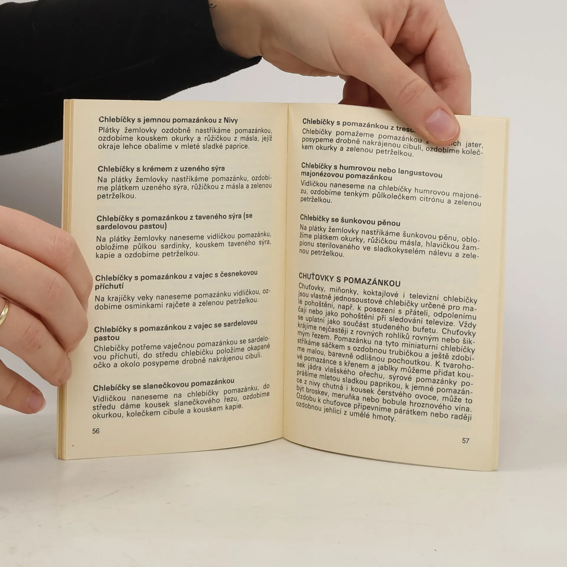 Předpisy na přípravu jednoduchých slaných i sladkých pomazánek doplňuje technologický postup jejich přípravy, receptury na přílohové pečivo k pomazánkám a předpisy na plněná vejce, zeleninu, ovoce, závitky a kornoutky