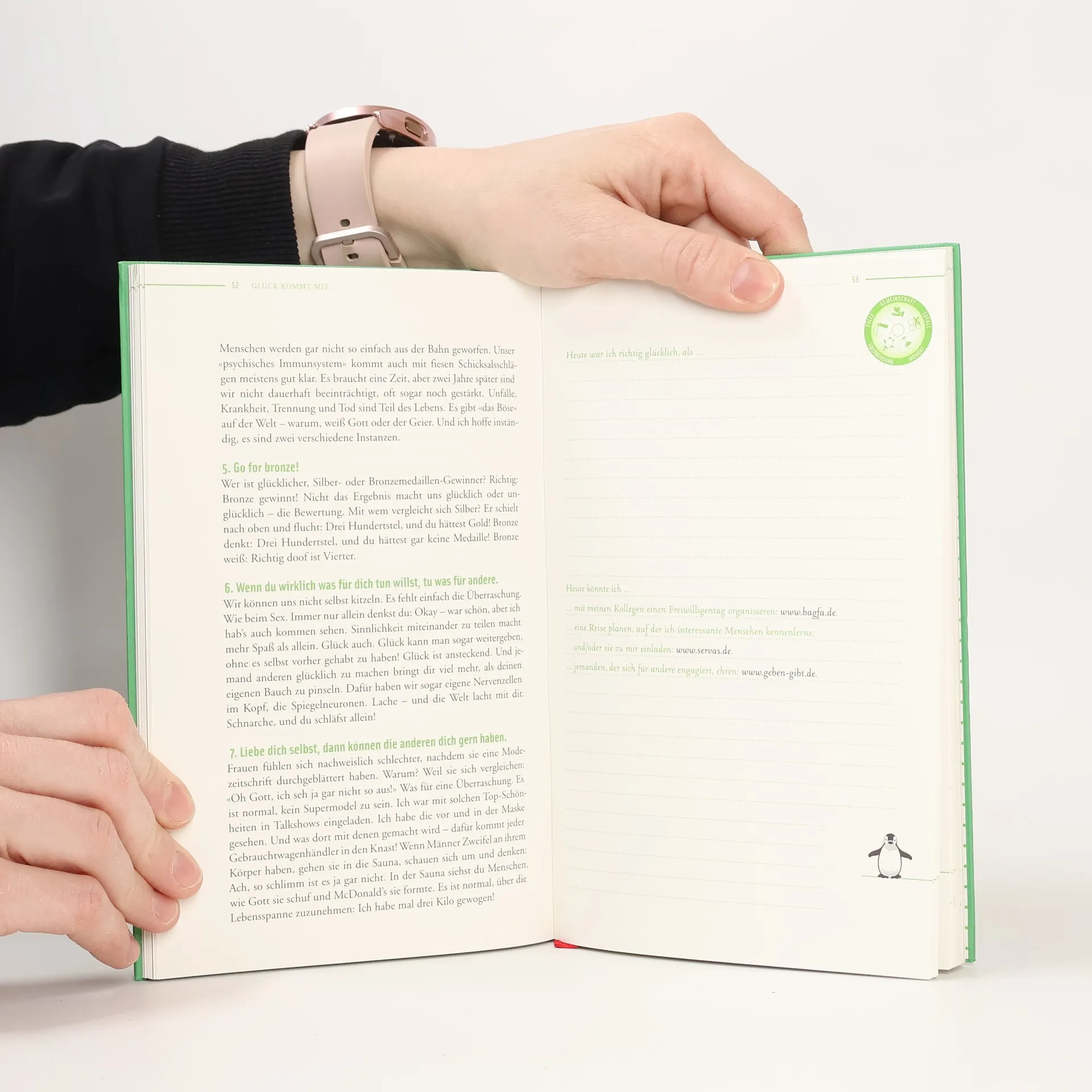 Vor Ihnen liegt ein Glückstagebuch, das Ihr Leben verändern kann. Etwas bescheidener: Vor Ihnen liegt ein Glückstagebuch, das Sie verändern können. Es ist eine Einladung, Ihrem Glück auf die Schliche zu kommen - mit Hilfe von Übungen, Zitaten, Witzen und Anregungen für jeden Tag. Glück ist kein Schicksal, sondern die Summe unserer täglichen Gedanken und Handlungen, halten Sie also Ihre kleinen Glücksmomente fest. Denn Glück ist eine Frage der Übung, nur meistens üben wir das Falsche.