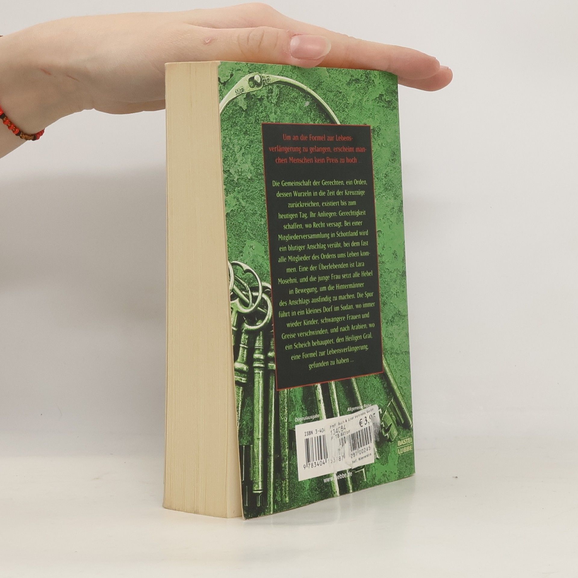 Um an die Formel zur Lebensverlängerung zu gelangen, erscheint manchen Menschen kein Preis zu hoch ... Die Gemeinschaft der Gerechten, ein Orden, dessen Wurzeln in die Zeit des dritten Kreuzzuges zurückreichen, existiert bis zum heutigen Tag. Ihr Anliegen: Gerechtigkeit schaffen, wo Recht versagt. Bei einer Mitgliederversammlung in Schottland wird ein blutiger Anschlag verübt, bei dem fast alle Mitglieder des Ordens ums Leben kommen. Eine der Überlebenden ist Lara Mosehni, und die junge Frau setzt alle Hebel in Bewegung, um die Hintermänner des Anschlags ausfindig zu machen. Die Spur führ in ein kleines Dorf im Sudan, wo immer wieder Kinder, schwangere Frauen und Greise verschwinden, und nach Arabien, wo ein Scheich behauptet, den Heiligen Gral, eine Formel zur Lebensverlängerung, gefunden zu haben ...