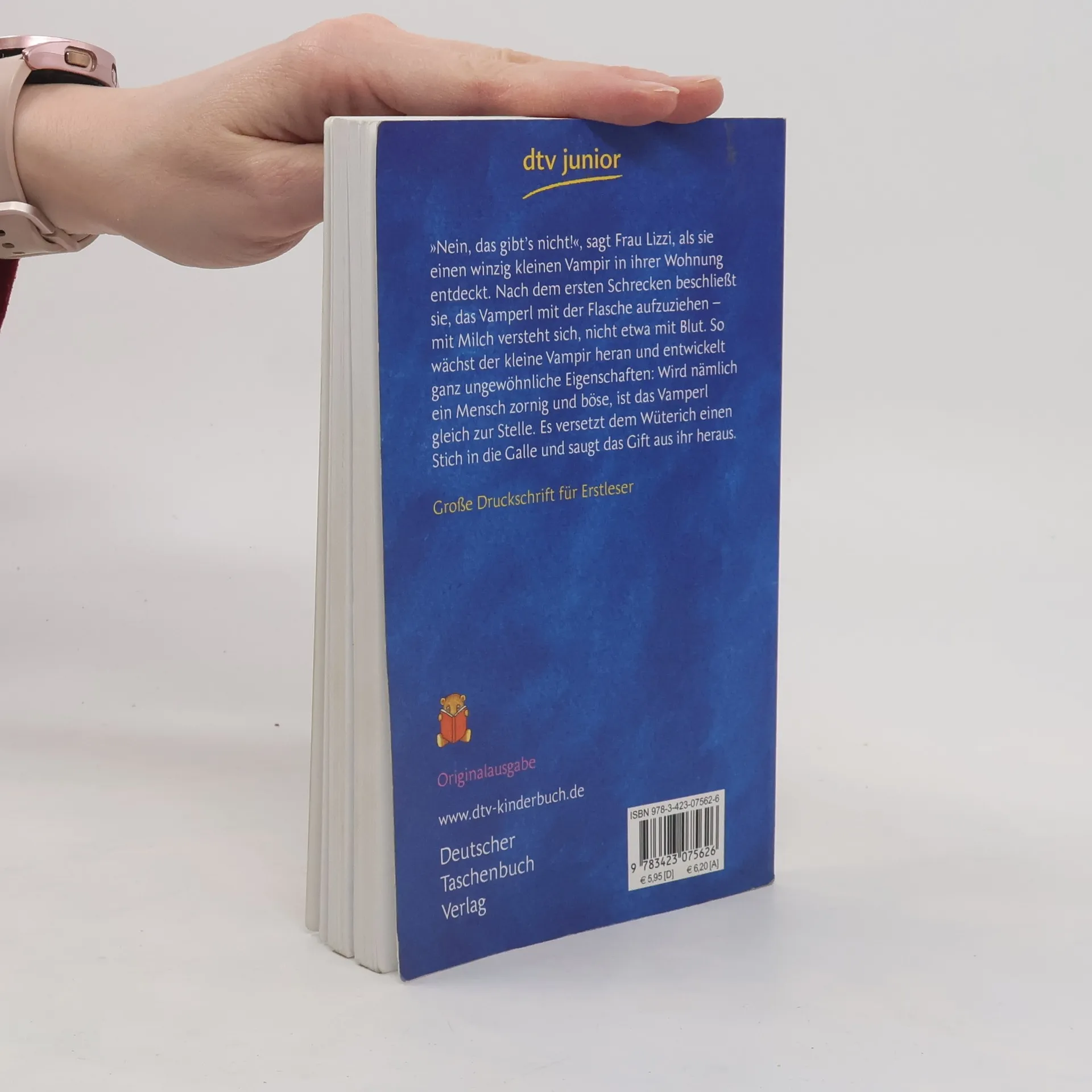 »Nein, das gibt's nicht!«, sagt Frau Lizzi, als sie einen winzigkleinen Vampir in ihrer Wohnung entdeckt. Nach dem ersten Schrecken beschließt sie das Vamperl mit der Flasche aufzuziehen - mit Milch versteht sich, nicht etwa mit Blut. So wächst der kleine Vampir heran und entwickelt ganz ungewöhnliche Eigenschaften: Wird nämlich ein Mensch zornig und böse, ist das Vamperl gleich zur Stelle. Es versetzt dem Wüterich einen Stich in die Galle und saugt das Gift aus ihr heraus! Zu diesem Buch finden Sie Quizfragen auf antolin. de