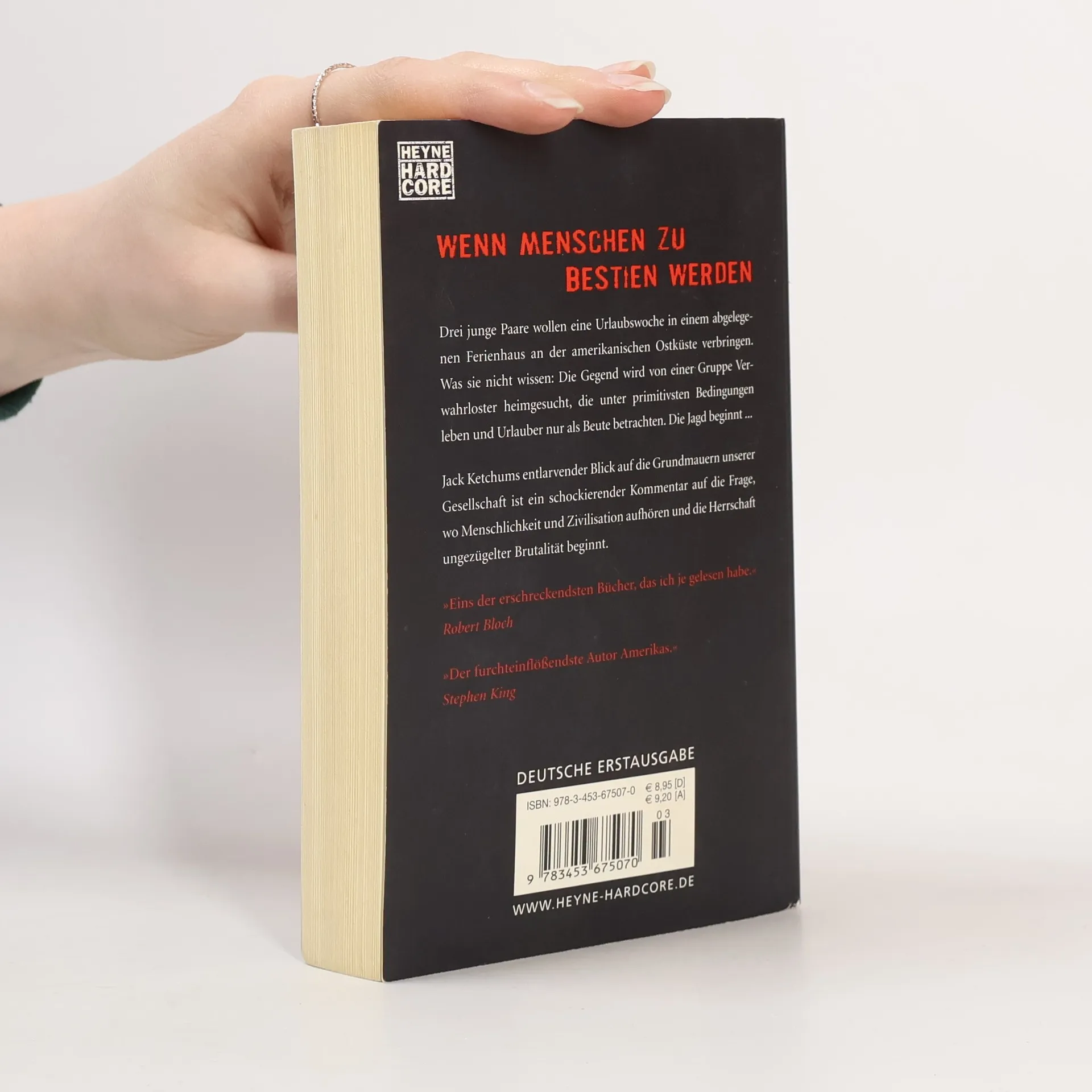 Wenn Menschen zu Bestien werden Drei junge Paare wollen eine Urlaubswoche in einem abgelegenen Ferienhaus an der amerikanischen Ostküste verbringen. Was sie nicht wissen: Die Gegend wird von einer Gruppe Verwahrloster heimgesucht, die unter primitivsten Bedingungen leben und Urlauber nur als Beute betrachten. Die Jagd beginnt … Jack Ketchums brillanter Debütroman gilt schon lange als Klassiker der Horrorliteratur. Sein entlarvender Blick auf die Grundmauern unserer Gesellschaft ist ein schockierender Kommentar auf die Frage, wo Menschlichkeit und Zivilisation aufhören und die Herrschaft ungezügelter Brutalität beginnt.