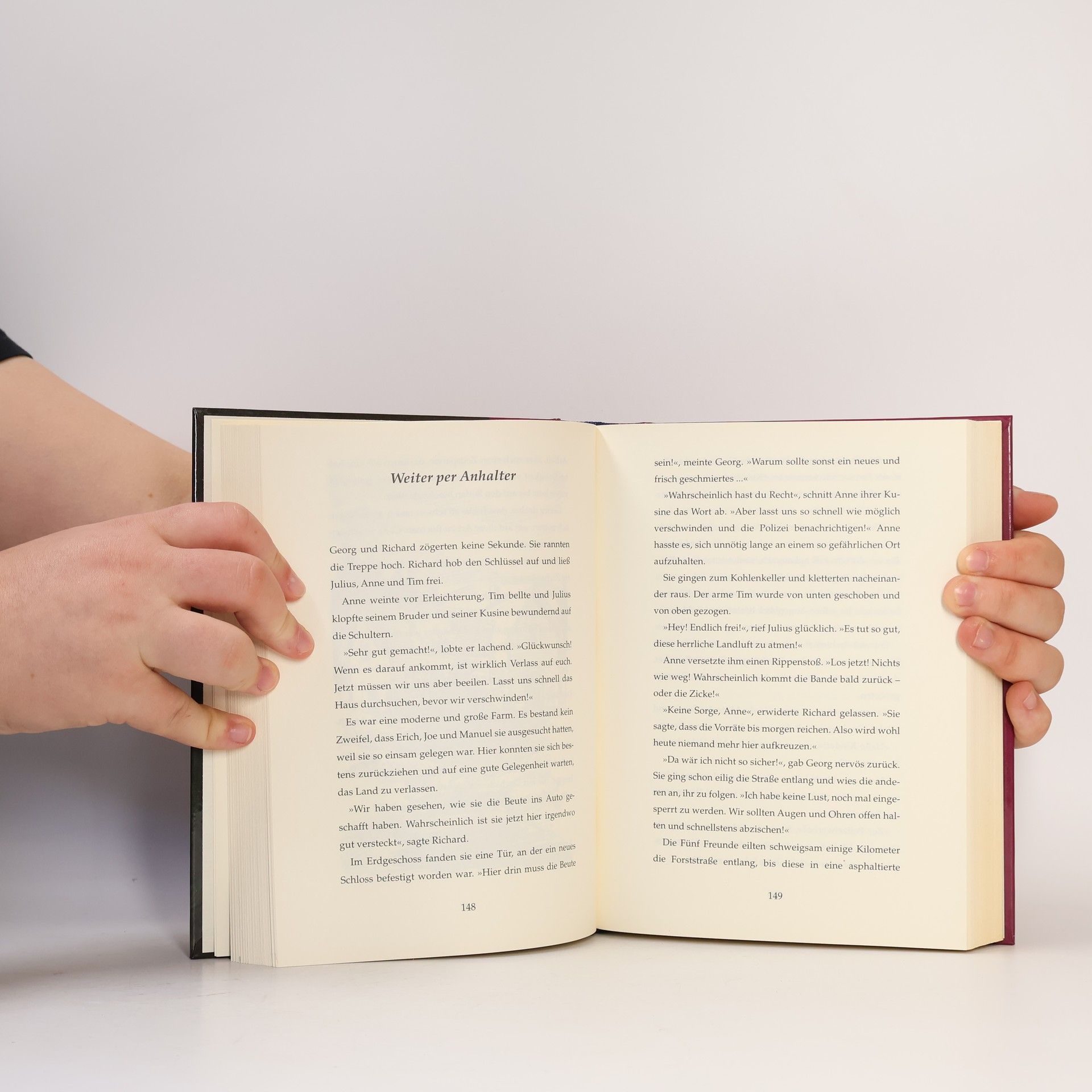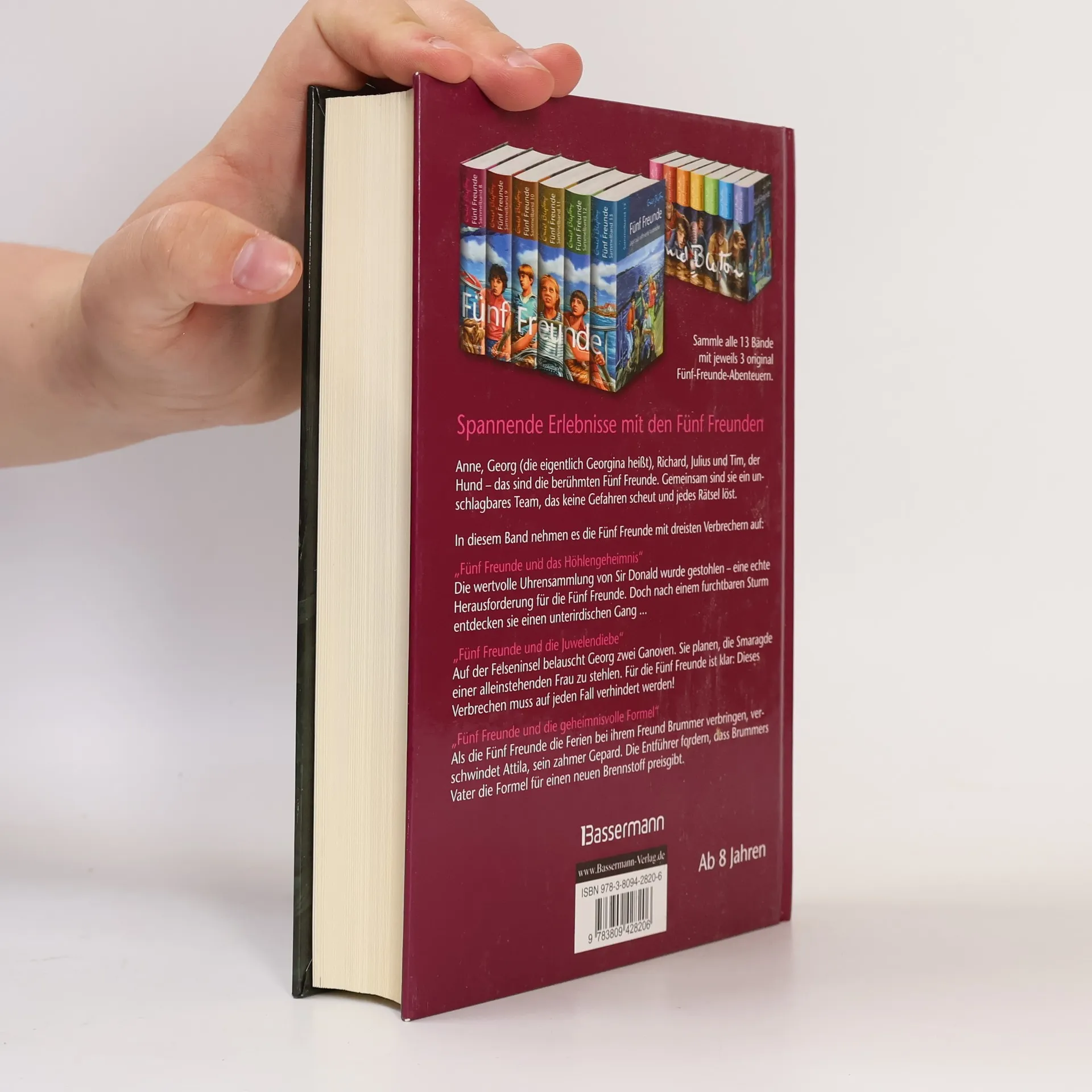 Spannende Erlebnisse mit den Fünf Freunden Seit über 50 Jahren fiebern Kinder mit, wenn die Fünf Freunde Anne, Georg (die eigentlich Georgina heißt), Richard, Julius und der Hund Tim in alten Gemäuern, dunklen Höhlen oder unterirdischen Gängen verborgene Schätze aufspüren oder sich gegen finstere Gestalten behaupten. In diesem Sammelband nehmen es die Fünf Freunde mit dreisten Verbrechern auf: „Fünf Freunde und das Höhlengeheimnis“ Die wertvolle Uhrensammlung von Sir Donald wurde gestohlen - eine echte Herausforderung für die Fünf Freunde. Doch nach einem furchtbaren Sturm entdecken sie einen unterirdischen Gang, der zu einem seltsamen Ginsterbusch führt ... „Fünf Freunde und die Juwelendiebe“ Auf der Felseninsel belauscht Georg zwei Ganoven. Sie planen, die Smaragde einer alleinstehenden Frau zu stehlen. Für die Fünf Freunde ist klar: Dieses Verbrechen muss auf jeden Fall verhindert werden! „Fünf Freunde und die geheimnisvolle Formel“ Als die Fünf Freunde die Ferien bei ihrem Freund Brummer verbringen, verschwindet Attila, Brummers zahmer Gepard. Die Entführer fordern, dass Brummers Vater, ein berühmter Wissenschaftler, ihnen seine Formel für einen neuen Brennstoff verrät.