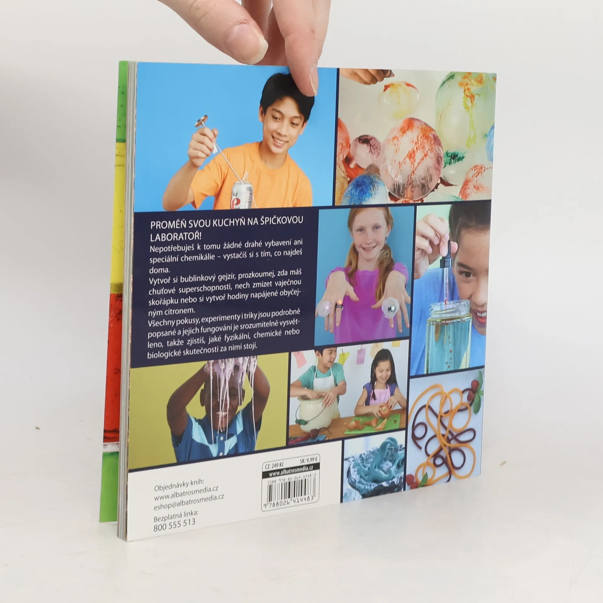 Proměň svou kuchyň na špičkovou laboratoř! Více než 30 zábavných pokusů Proměň svou kuchyň na špičkovou laboratoř! Nepotřebuješ k tomu žádné drahé vybavení ani speciální chemikálie – vystačíš si s tím, co najdeš doma. Vytvoř si bublinkový gejzír, prozkoumej, zda máš chuťové superschopnosti, nech zmizet vaječnou skořápku nebo si vytvoř hodiny napájené obyčejným citronem. Všechny pokusy, experimenty i triky jsou podrobně popsané a jejich fungování je srozumitelně vysvětleno, takže zjistíš, jaké fyzikální, chemické nebo biologické skutečnosti za nimi stojí.