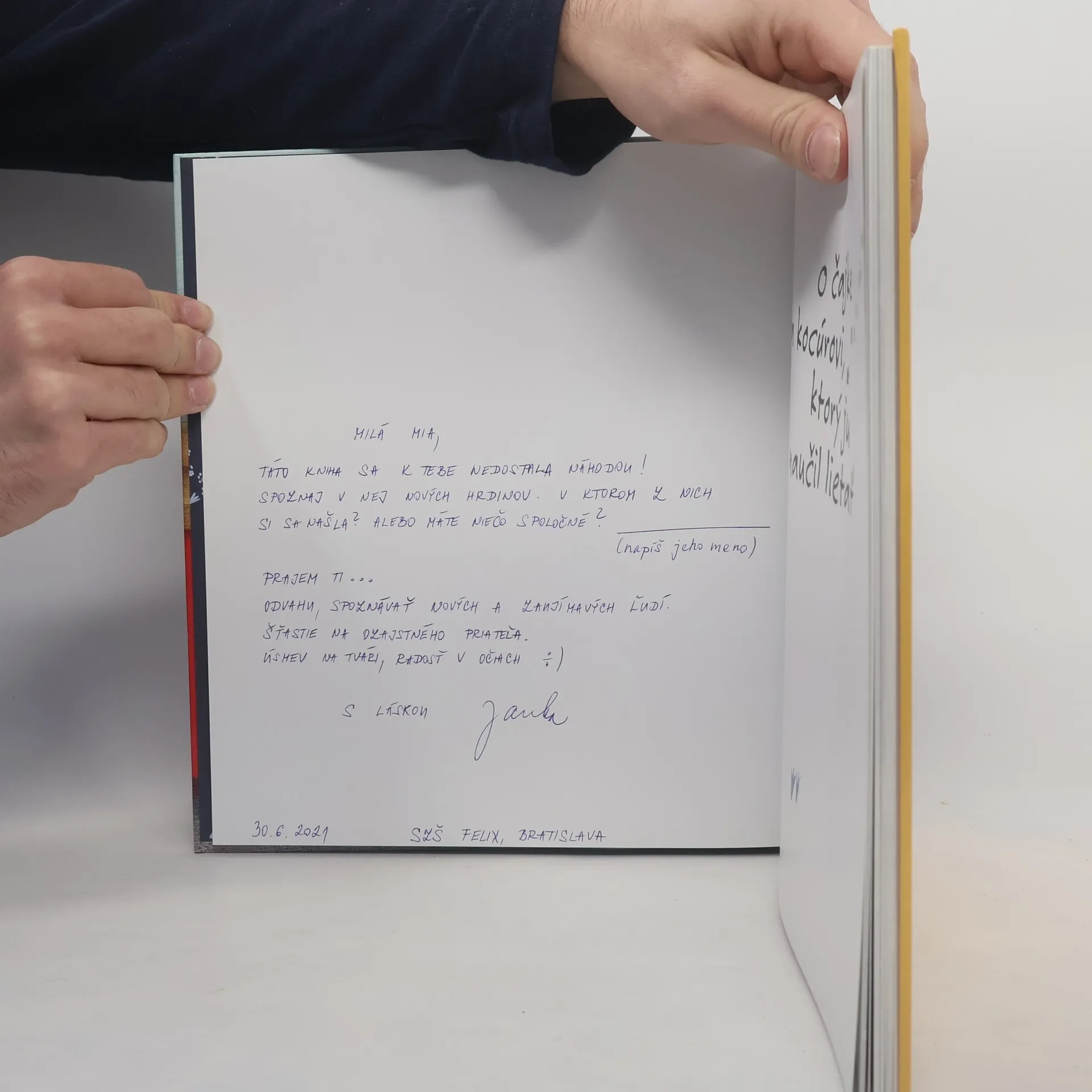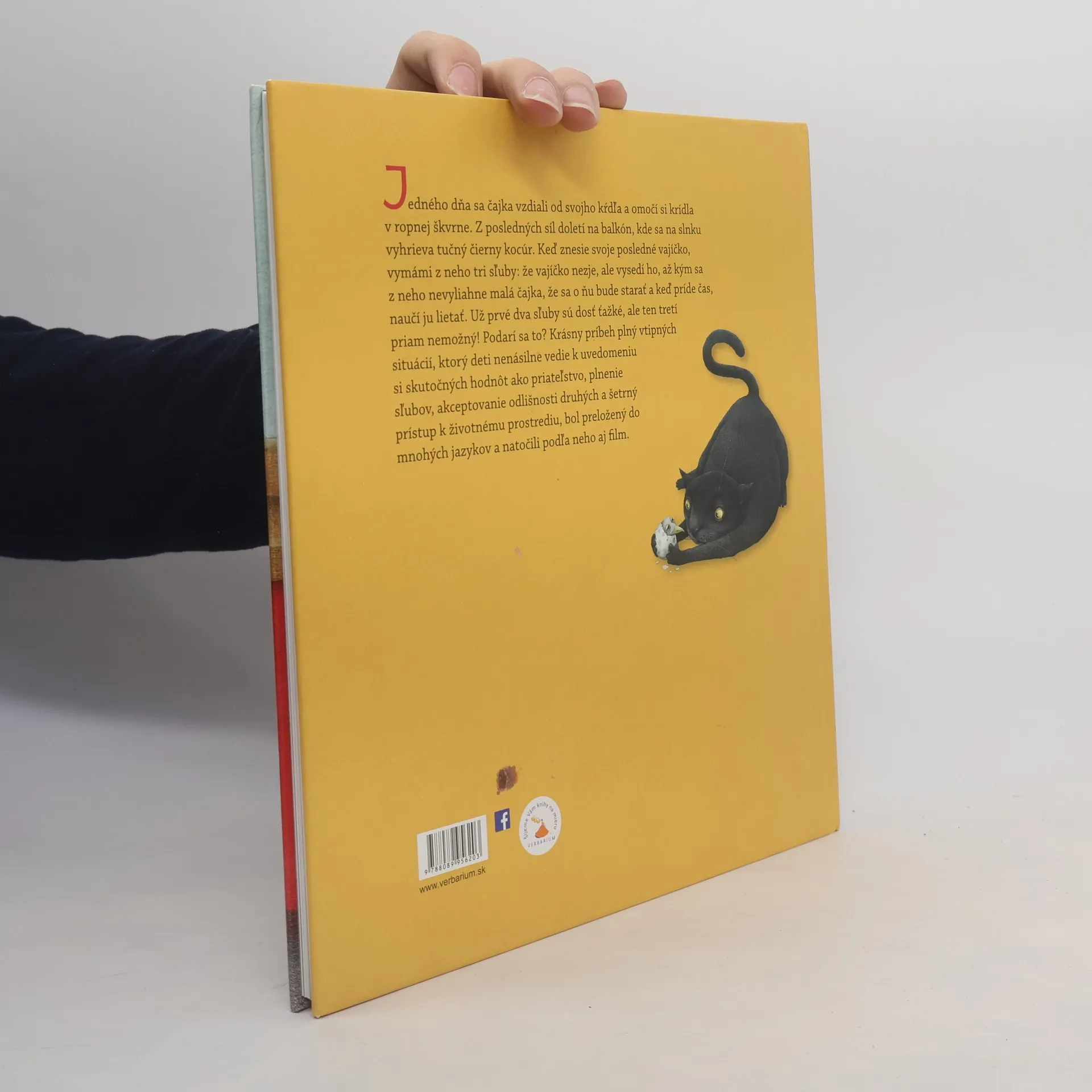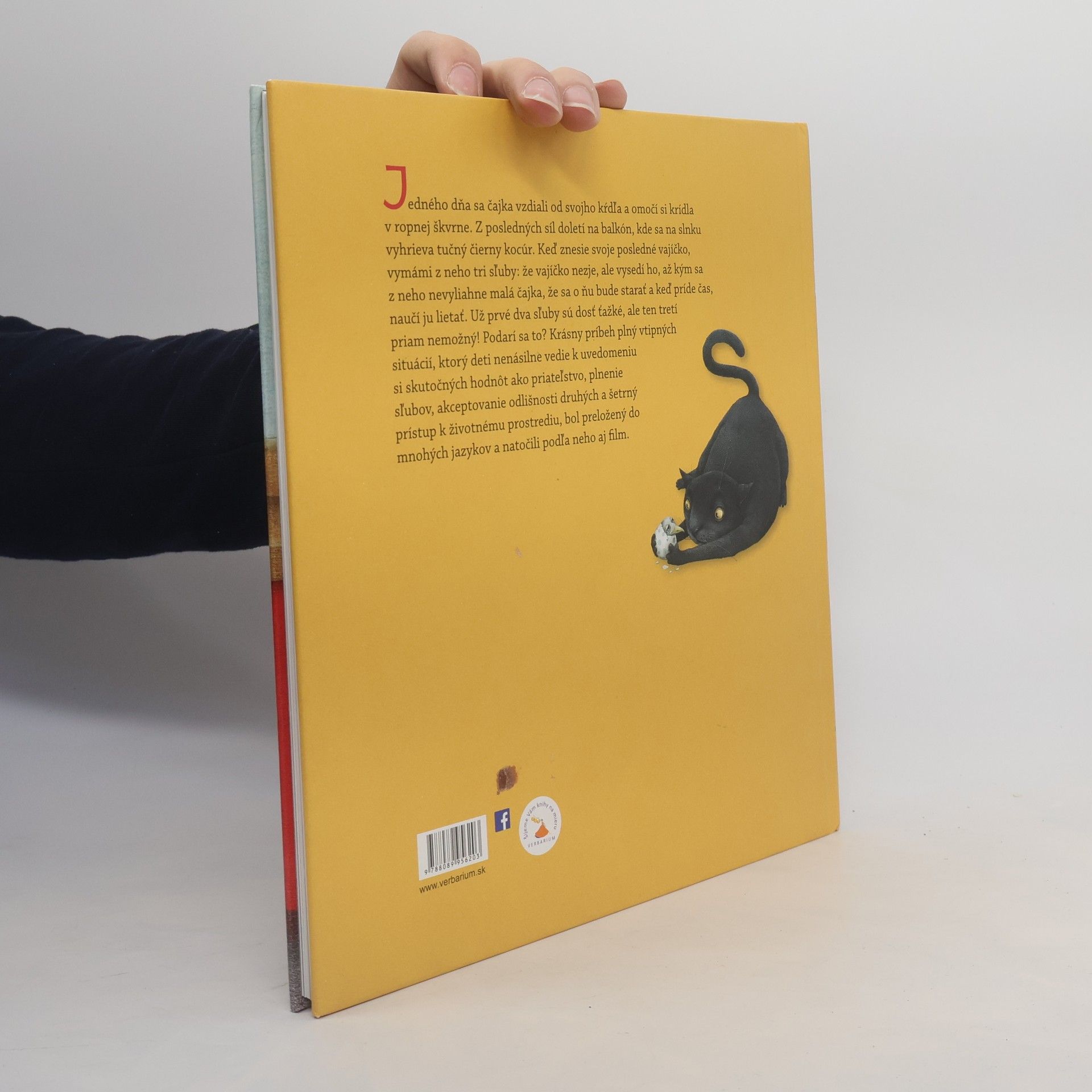 Jedného dňa sa čajka vzdiali od svojho kŕdľa a omočí si krídla v ropnej škvrne. Z posledných síl doletí na balkón, kde sa na slnku vyhrieva tučný čierny kocúr. Keď znesie svoje posledné vajíčko, vymámi z neho tri sľuby: že vajíčko nezje, ale vysedí ho, až kým sa z neho nevyliahne malá čajka, že sa o ňu bude starať a keď príde čas, naučí ju lietať. Už prvé dva sľuby sú dosť ťažké, ale ten tretí priam nemožný! Podarí sa to? Krásny príbeh plný vtipných situácií, ktorý deti nenásilne vedie k uvedomeniu si skutočných hodnôt ako priateľstvo, plnenie sľubov, akceptovanie odlišnosti druhých a šetrný prístup k životnému prostrediu, bol preložený do mnohých jazykov a natočili podľa neho aj film.