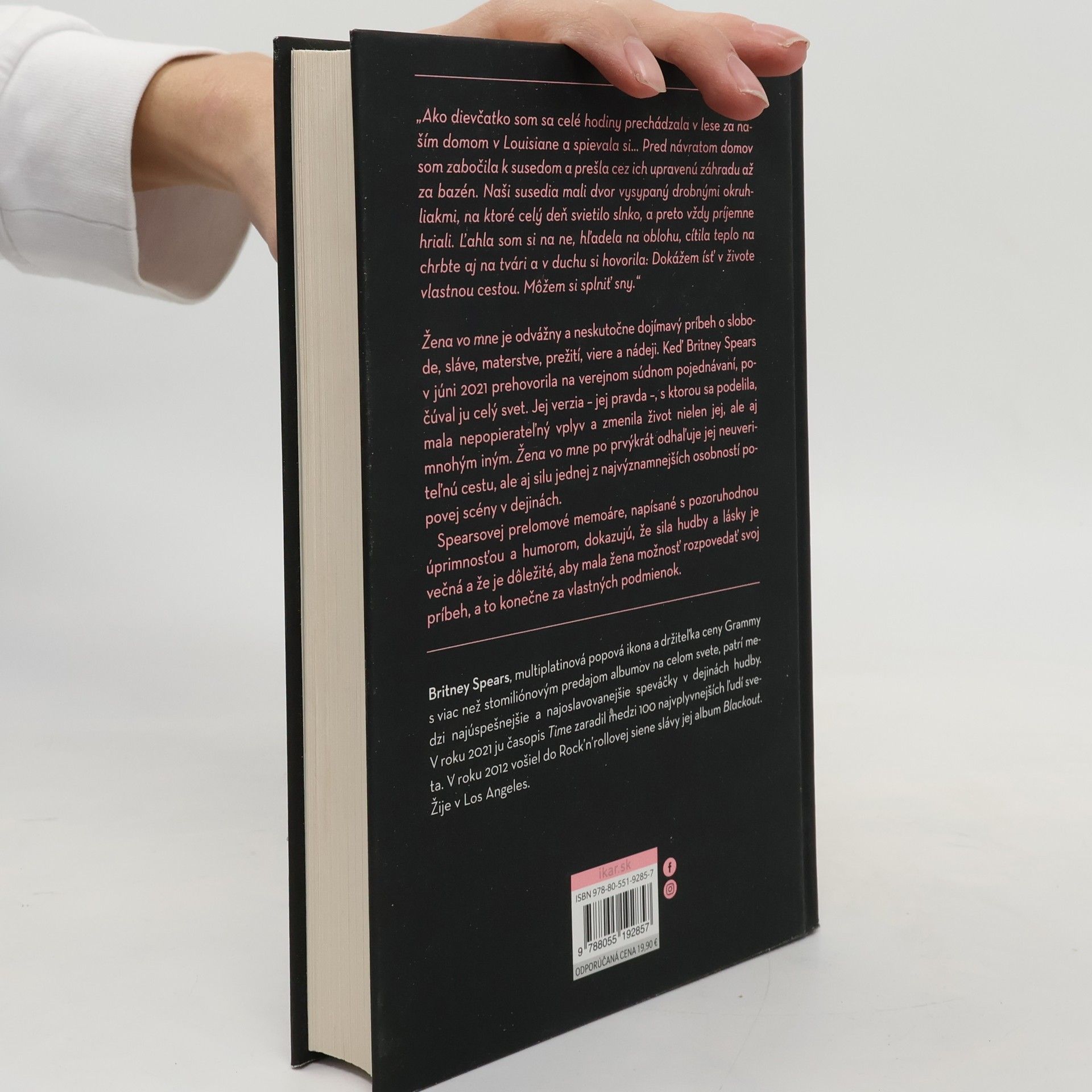 Žena vo mne je odvážny a neskutočne dojímavý príbeh o slobode, sláve, materstve, prežití, viere a nádeji. Keď Britney Spears v júni 2021 prehovorila na verejnom súdnom pojednávaní, počúval ju celý svet. Jej verzia – jej pravda ?, s ktorou sa podelila, mala nepopierateľný vplyv a zmenila život nielen jej, ale aj mnohým iným. Žena vo mne po prvýkrát odhaľuje jej neuveriteľnú cestu, ale tiež silu jednej z najvýznamnejších osobností popovej scény v dejinách. Spearsovej prelomové memoáre, napísané s pozoruhodnou úprimnosťou a humorom, dokazujú, že sila hudby a lásky je večná a že je dôležité, aby mala žena možnosť rozpovedať svoj príbeh, a to konečne za vlastných podmienok.
