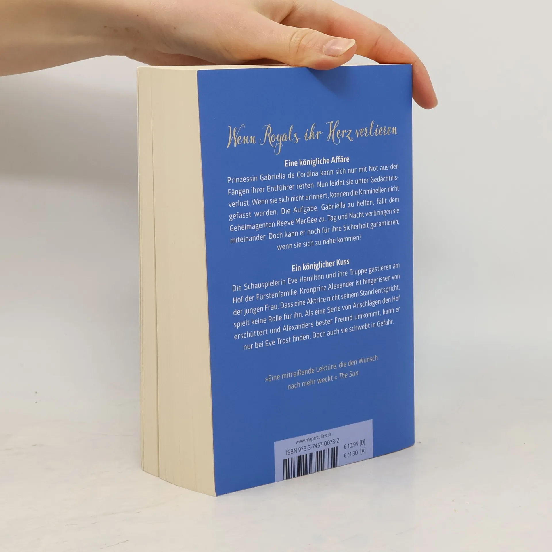 Eine königliche Affäre Prinzessin Gabriella de Cordina kann sich nur mit Not aus den Fängen ihrer Entführer retten. Nun leidet sie unter Gedächtnisverlust. Wenn sie sich erinnert, dann schwebt sie in Gefahr, denn die Täter trachten ihr noch nach dem Leben. Wenn sie sich nicht erinnert, können die Kriminellen nicht gefasst werden. Die Aufgabe, Gabriella zu helfen, fällt dem Geheimagenten Reeve MacGee zu. Tag und Nacht verbringen die beiden miteinander. Doch kann er noch für ihre Sicherheit garantieren, wenn die beiden sich zu nahe kommen? Ein königlicher Kuss Die Schauspielerin Eve Hamilton und ihre Truppe gastieren am Hof der Fürstenfamilie. Kronprinz Alexander ist hingerissen von der wunderbaren jungen Frau. Dass eine Aktrice nicht seinem Stand entspricht, spielt keine Rolle für den attraktiven Prinzen. Er wirkt jedoch distanziert und kalt auf sie. Als eine Serie von Anschlägen den Hof erschüttert und Alexanders bester Freund umkommt, kann er nur bei Eve Trost finden. Doch auch sie schwebt in Gefahr. »Die Verlagswelt wird es sehr schwer haben, eine vielseitigere und erfindungsreichere Autorin als Roberts zu finden.« The Washington Post Book World