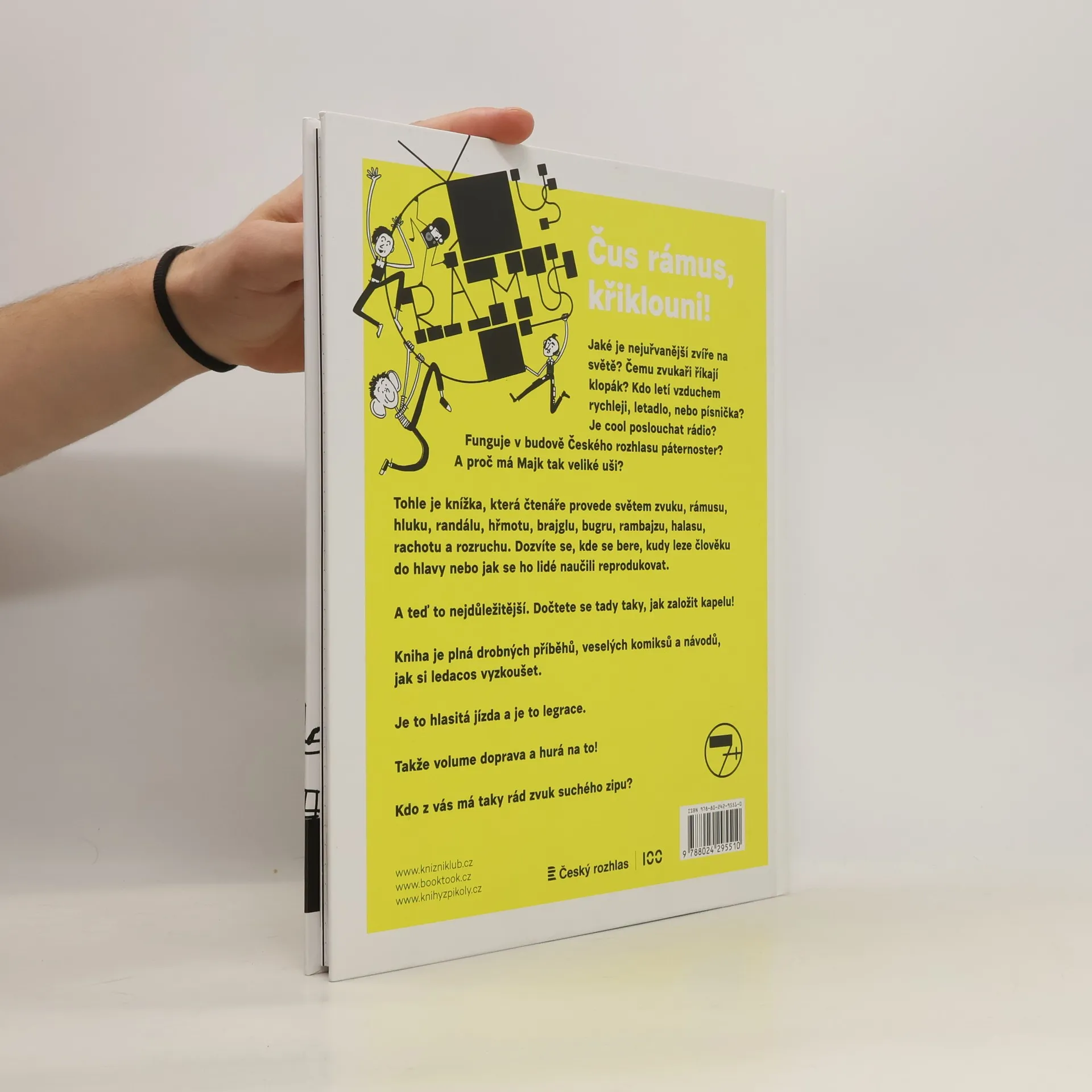 Čus rámus, křiklouni! Víte, jaké je nejuřvanější zvíře na světě? Čemu zvukaři říkají klopák? Kdo letí vzduchem rychleji? Letadlo, nebo písnička? Je cool poslouchat rádio? Funguje v budově Českého rozhlasu páternoster? A proč má Majk tak veliké uši? Tohle je knížka, která vás provede světem zvuku, rámusu, hluku, randálu, hřmotu, brajglu, bugru, rambajzu, halasu, rachotu a rozruchu. Dozvíte se, kde se bere, kudy leze člověku do hlavy nebo jak se ho lidé naučili reprodukovat. A teď to nejdůležitější. Také se tu dočtete, jak založit kapelu! Kniha je plná drobných příběhů, veselých komiksů a návodů, jak si ledacos vyzkoušet. Je to hlasitá jízda a legrace. Takže volume doprava a hurá na to!
