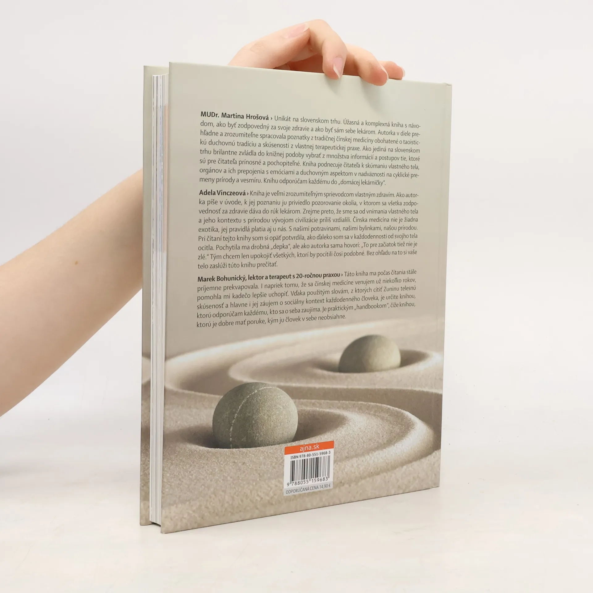 Unikát na slovenskom trhu. Úžasná a komplexná kniha s návodom, ako byť zodpovedný za svoje zdravie a ako byť sám sebe lekárom. Autorka v diele prehľadne a zrozumiteľne spracovala poznatky z tradičnej čínskej medicíny obohatené o taoistickú duchovnú tradíciu a skúsenosti z vlastnej terapeutickej praxe. Ako jediná na slovenskom trhu brilantne zvládla do knižnej podoby vybrať z kvánt informácií a postupov tie, ktoré sú pre čitateľa prínosné a pochopiteľné. Kniha podnecuje čitateľa k skúmaniu vlastného tela, orgánov a ich prepojenia s emóciami a duchovným aspektom v nadväznosti na cyklické premeny prírody a vesmíru.Knihu odporúčam každému do „domácej lekárničky“. MUDr. Martina Hrošová