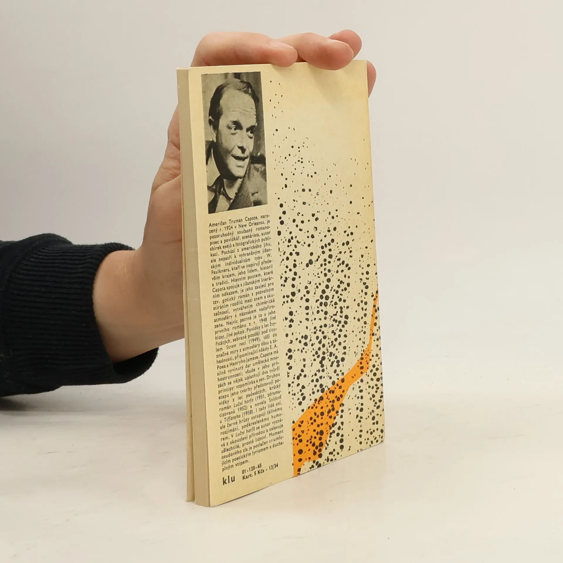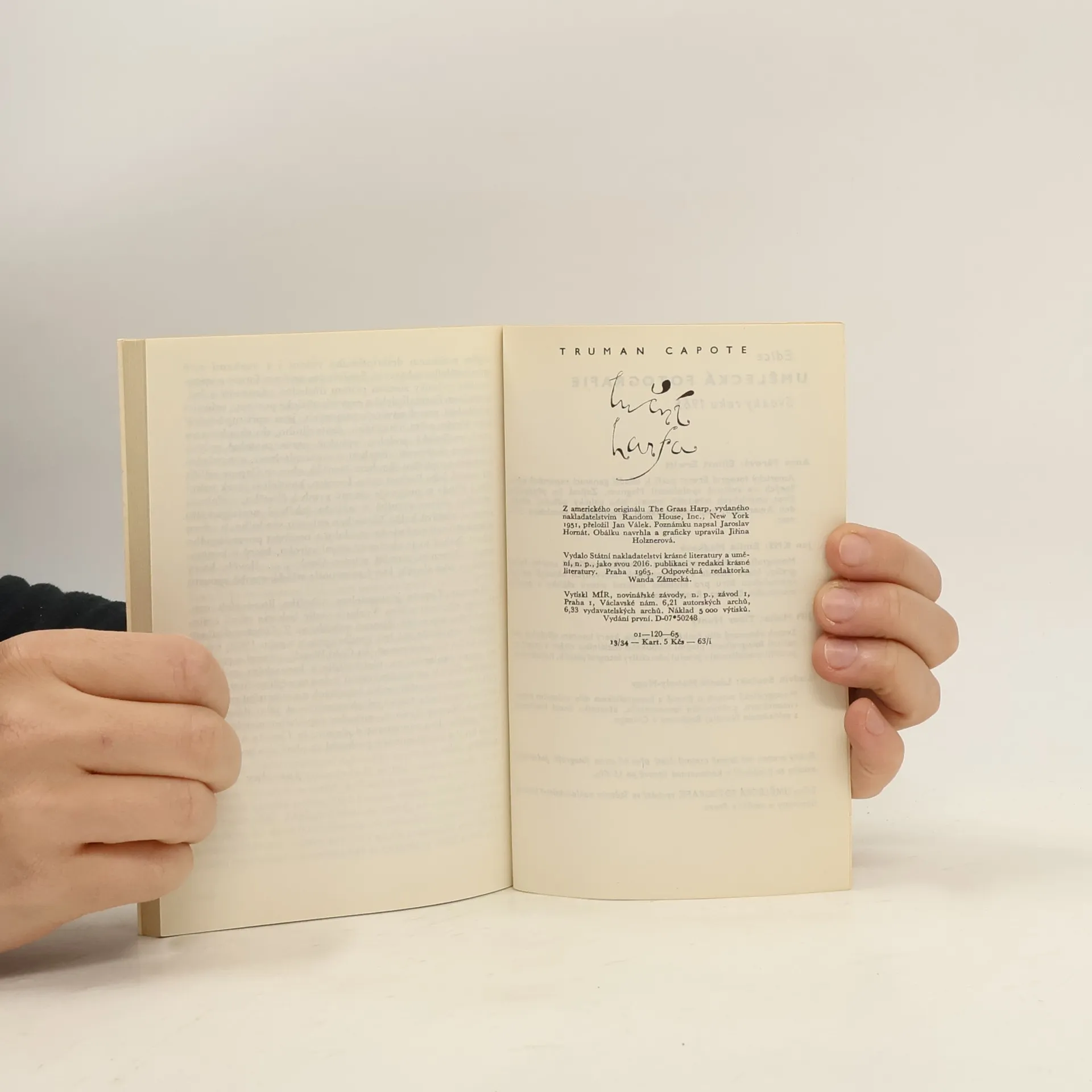 Autobiografická knížka známého amerického autora Trumana Capoteho Luční harfa líčí spisovatelova chlapecká léta, jež po smrti rodičů trávil v podivínské domácnosti svých tet, tiché a romantické Dolly a podnikavé leč diktátorské Vereny. Dospívající Collin si samozřejmě víc rozumíse svobodomyslnou Dolly, která miluje přírodu a vyrábí podle starého cikánského receptu úspěšný léčivý preparát... Poznámku napsal Jaroslav Hornát.