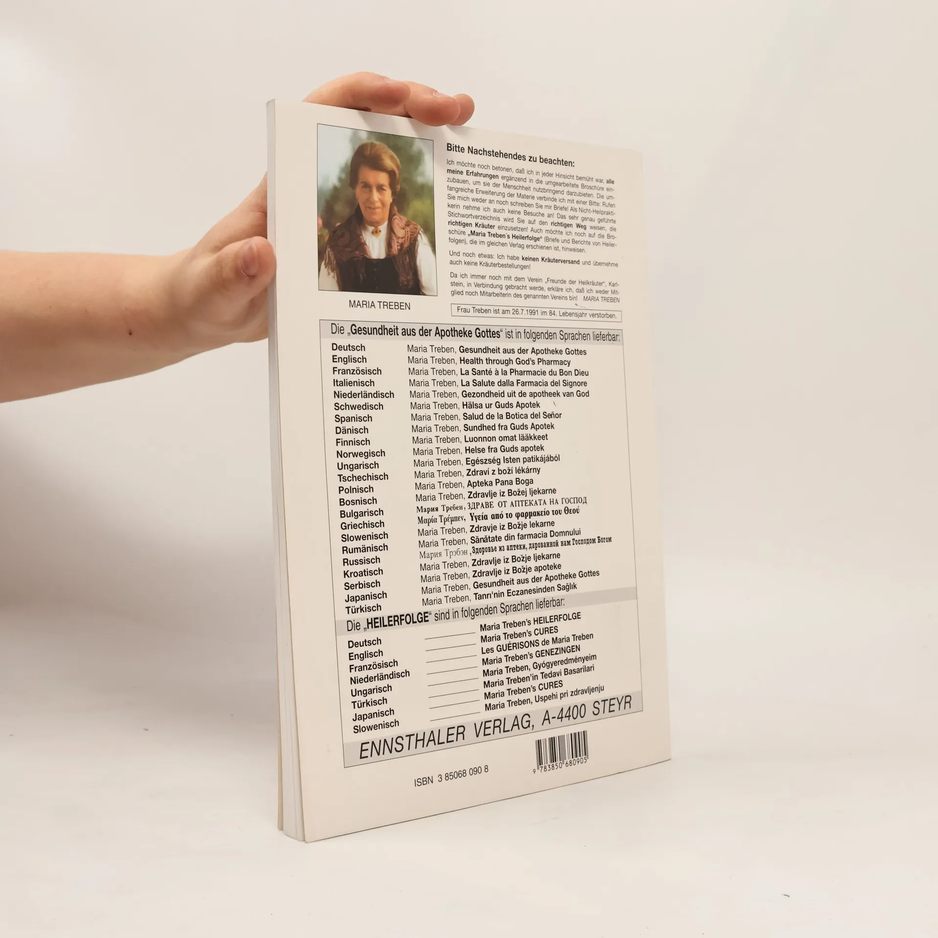 Das Hauptwerk Maria Trebens, die „Gesundheit aus der Apotheke Gottes“, ist 1980 im Ennsthaler Verlag erschienen und wurde bisher in 27 Sprachen übersetzt. Es werden 31 Heilkräuter, deren Heilkraft und Anwendungsmöglichkeiten als Tee, aufzulegender Brei, Bad oder Frischsaft ausführlich beschrieben. Maria Treben hat sich als eine der wichtigsten Pioniere der Kräuterheilkunde ihren Platz in der Geschichte erobert. Viele verehrten sie wie eine Heilige, tatsächlich war sie ein Frau, die sich ein Leben lang mit Heilkräutern beschäftigte und ihre Erfahrungen möglichst vielen Menschen nahebringen wollte. In all den Jahren hat ihre Popularität und die ihrer Werke nie nachgelassen. Ihre Bücher erleben heute durch die fortschreitende Anwendung der Alternativmedizin eine neue und ungebrochene Aktualität.