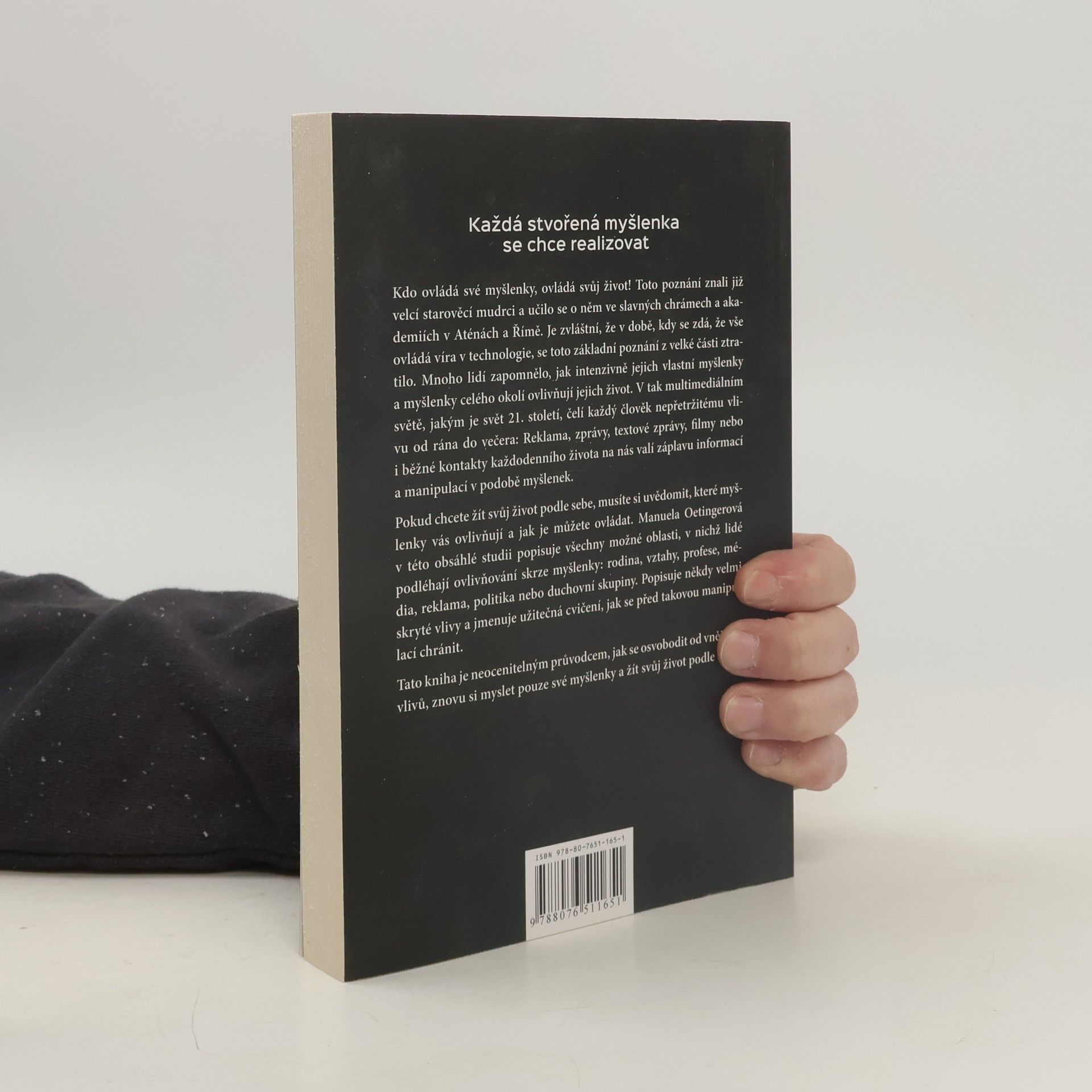 Kdo ovládá své myšlenky, ovládá svůj život! Toto poznání znali již velcí starověcí mudrci a učilo se o něm ve slavných chrámech a akademiích v Aténách a Římě. Je zvláštní, že v době, kdy se zdá, že vše ovládá víra v technologie, se toto základní poznání z velké části ztratilo. Mnoho lidí zapomnělo, jak intenzivně jejich vlastní myšlenky a myšlenky celého okolí ovlivňují jejich život. V tak multimediálním světě, jakým je svět 21. století, čelí každý člověk nepřetržitému vlivu od rána do večera: Reklama, zprávy, textové zprávy, filmy nebo i běžné kontakty každodenního života na nás valí záplavu informací a manipulací v podobě myšlenek. Pokud chcete žít svůj život podle sebe, musíte si uvědomit, které myšlenky vás ovlivňují a jak je můžete ovládat. Manuela Oetingerová v této obsáhlé studii popisuje všechny možné oblasti, v nichž lidé podléhají ovlivňování skrze myšlenky: rodina, vztahy, profese, média, reklama, politika nebo duchovní skupiny. Popisuje někdy velmi skryté vlivy a jmenuje užitečná cvičení, jak se před takovou manipulací chránit. Tato kniha je neocenitelným průvodcem, jak se osvobodit od vnějších vlivů, znovu si myslet pouze své myšlenky a žít svůj život podle sebe!