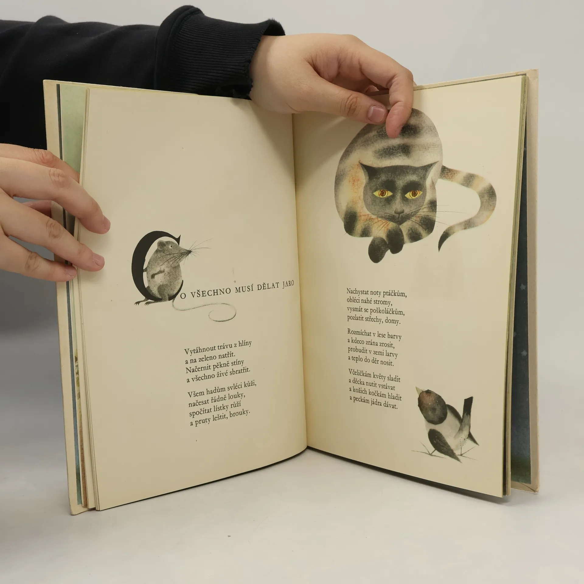 Prosté verše, které básník zpívá "do usínání dětí" a jimiž se vžívá do originálního dětského světa, kde myš je probuzená hlína, ryba hastrmaní lžička, zamrzlé sklo je zabaleno do větviček, aby mu nebylo zima, vyprávějí dětem o kosu, který si zavazoval na trávníku tkaničku-žížalu, o jaru, o návratu vlaštovek, o kohoutu, který snáší kraslice, o vrabcích darmojedech, žijících z cizí práce, o paviánech, o "milosrdné zemi Africe" kde se "děcka nemyjí a nečesají", o datlovi, který proklepává les, o hrdličce, přivázané ke kolébce Ježíškově. Nakreslil Ota Janeček. Pro čtenáře od 9 let.