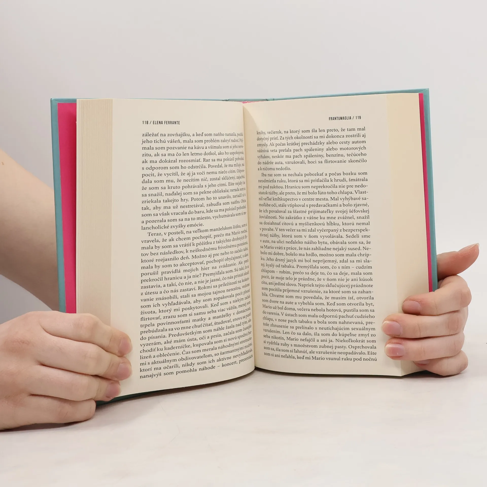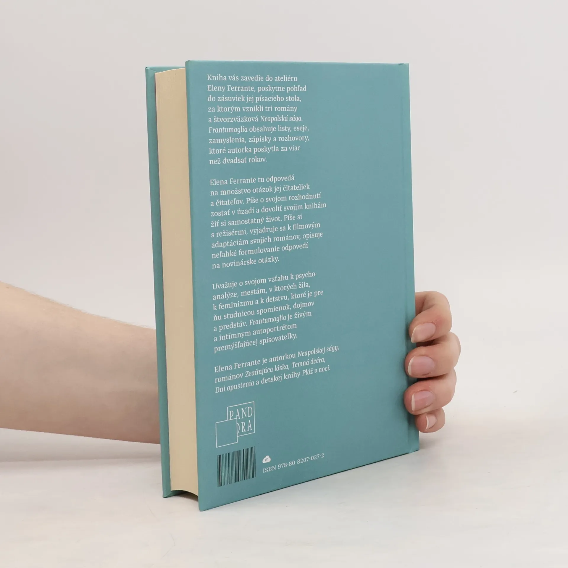 Táto kniha vás zavedie do ateliéru Eleny Ferrante, poskytne pohľad do zásuviek jej písacieho stola, za ktorým vznikli tri romány a štvorzväzková Neapolská sága. Frantumaglia obsahuje listy, eseje, zamyslenia, zápisky a rozhovory, ktoré autorka poskytla za viac než dvadsať rokov. Elena Ferrante tu odpovedá na množstvo otázok jej čitateliek a čitateľov. Píše o svojom rozhodnutí zostať v úzadí a dovoliť svojim knihám žiť si samostatný život. Píše si s režisérmi, vyjadruje sa k filmovým adaptáciám svojich románov, opisuje neľahké formulovanie odpovedí na novinárske otázky. Uvažuje o svojom vzťahu k psychoanalýze, mestám, v ktorých žila, k feminizmu a k detstvu, ktoré je pre ňu studnicou spomienok, dojmov a predstáv. Frantumaglia je živým a intímnym autoportrétom premýšľajúcej spisovateľky.