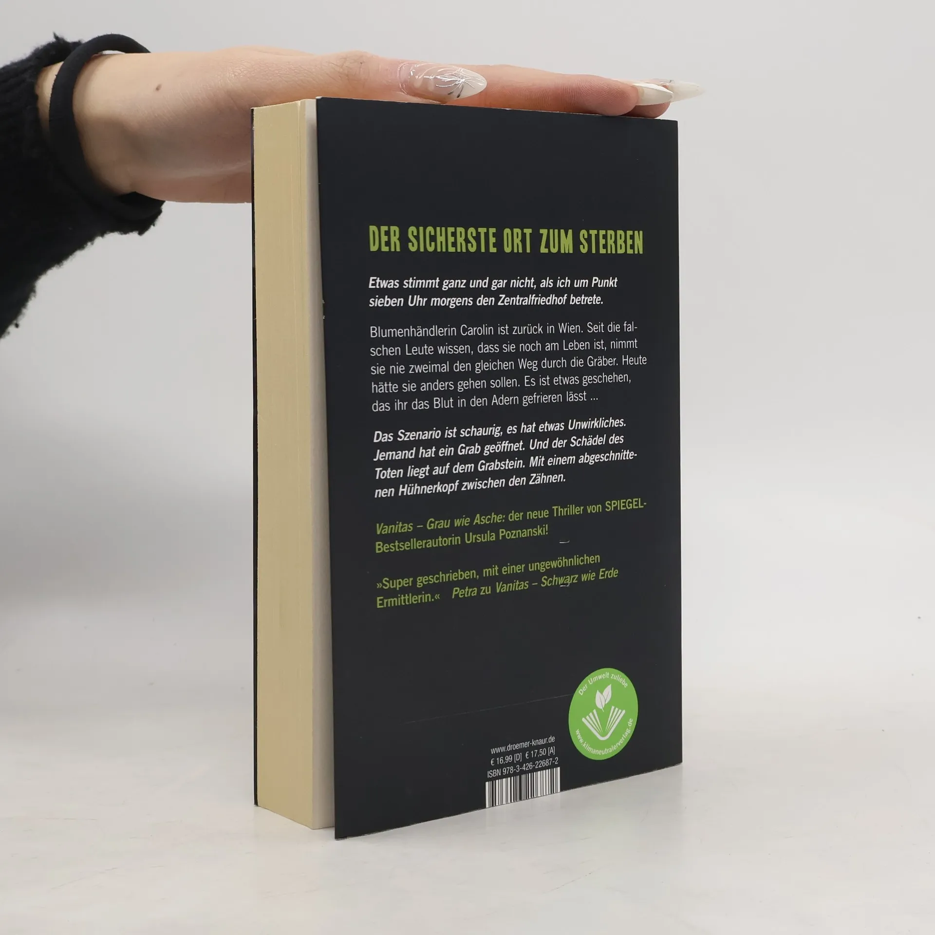 Seit wann muss man auf dem Friedhof um sein Leben fürchten? Der Thriller von Ursula Poznanski um die Wiener Blumenhändlerin ist die Fortsetzung zu VANITAS - Schwarz wie Erde! Carolin ist zurück in Wien und in der Blumenhandlung am Zentralfriedhof. Sie weiß, dass ihre Verfolger sie nicht mehr für tot halten, doch sie scheinen ihre Spur in München verloren zu haben. Als sie sich etwas sicherer fühlt, wird der Friedhof von Grabschändern heimgesucht. Immer wieder werden Gräber geöffnet, Überreste herausgeholt und Grabsteine mit satanistischen Symbolen beschmiert. Bald liegt auf einem der Gräber eine frische Leiche – hat jemand den Grabschändern in die Quere gekommen? Die öffentliche Aufmerksamkeit und das Polizeiaufkommen rund um den Friedhof sind Carolin unangenehm. Noch irritierender ist ein junger Mann, der täglich den Blumenladen besucht. Sein Interesse gilt ihrer Kollegin, doch Carolin hat den Verdacht, dass er in Wahrheit hinter ihr her ist. Sie trifft eine folgenschwere Entscheidung... Ursula Poznanski, Autorin der Erebos-Megaseller, begeistert ihre Leser mit einem Bestseller über die Sprache der Blumen. Die Presse lobt den Krimi, der mit den Grenzen zwischen Leben und Tod spielt, und hebt die durchgehende Spannung bis zur letzten Seite hervor.
