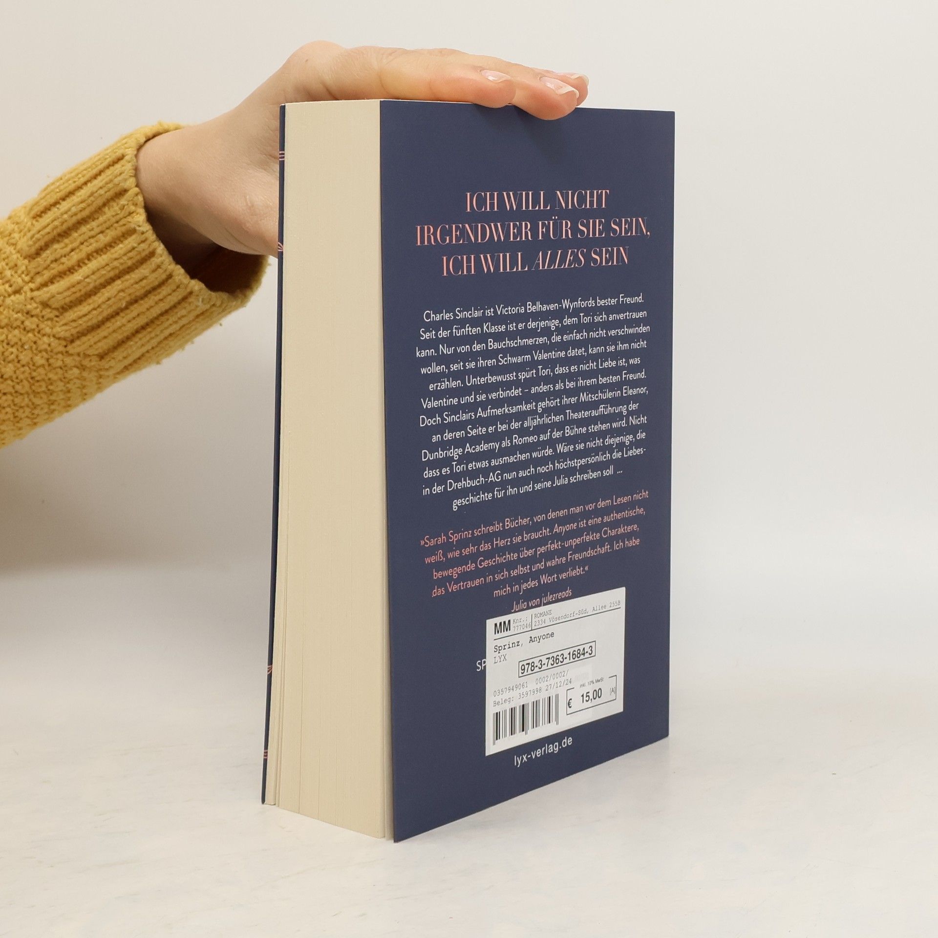 Ich will nicht Irgendwer für sie sein, ich will alles sein Charles Sinclair ist Victoria Belhaven-Wynfords bester Freund. Seit der fünften Klasse ist er derjenige, dem Tori sich anvertrauen kann. Nur von den Bauchschmerzen, die einfach nicht verschwinden wollen, seit sie ihren Schwarm Valentine datet, kann sie ihm nicht erzählen. Unterbewusst spürt Tori, dass es nicht Liebe ist, was Valentine und sie verbindet - anders als bei ihrem besten Freund. Doch Sinclairs Aufmerksamkeit gehört ihrer Mitschülerin Eleanor, an deren Seite er bei der alljährlichen Theateraufführung der Dunbridge Academy als Romeo auf der Bühne stehen wird. Nicht dass es Tori etwas ausmachen würde. Wäre sie nicht diejenige, die in der Drehbuch-AG nun auch noch höchstpersönlich die Liebesgeschichte für ihn und seine Julia schreiben soll ... Band 2 der DUNBRIDGE-ACADEMY-Reihe von SPIEGEL-Bestseller-Autorin Sarah Sprinz