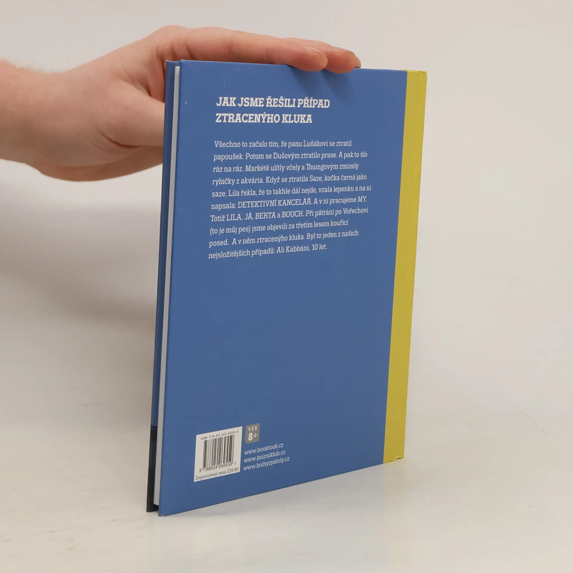 Nejdřív se ztratil panu Luňákovi papoušek. Potom se ztratilo Dušovým prase. To se stalo v pondělí. A pak to šlo ráz na ráz. Markétě ulítly včely a Thuingovým zmizely rybičky z akvária. Když se pak ve středu ztratila černá kočka Saze, tak Lila řekla, že to takhle dál nejde, že se toho musíme ujmout. A hned vzala lepenku a na ni napsala: DETEKTIVNÍ KANCELÁŘ. A v ní pracujeme MY. Totiž LILA, JÁ, BERTA a BOUCH. Při pátrání po Vořechovi (to je můj pes) jsme objevili za třetím lesem kouřící posed. A v něm ztracenýho kluka. Byl to jeden z našich nejsložitějších případů: Ali Kabbáni, 10 let. Vtipně a svižně vyprávěný příběh o nevážných věcech, ale i jedné vážné, ilustrovala Galina Miklínová.