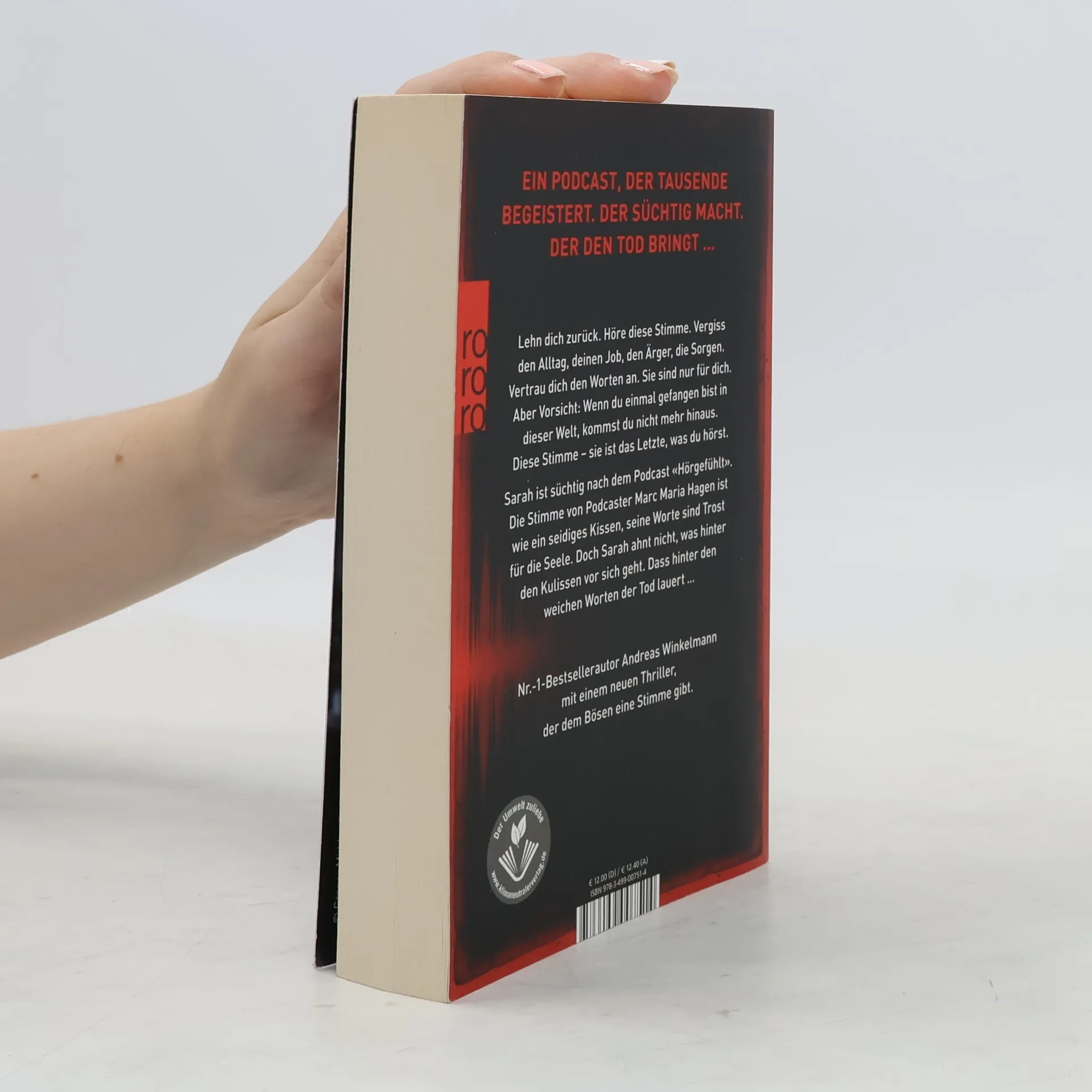 Ein Podcast, der Tausende begeistert. Der süchtig macht. Der den Tod bringt … Lehn dich zurück. Höre diese Stimme. Vergiss deinen Alltag, den Job, den Ärger, die Sorgen. Vertrau dich den Worten an. Sie sind nur für dich. Aber Vorsicht: Wenn du einmal gefangen bist in dieser Welt, kommst du nicht mehr hinaus. Diese Stimme – sie ist das Letzte, was du hörst. Sarah ist süchtig nach dem Podcast «Hörgefühlt». Die Stimme von Podcaster Marc Maria Hagen ist wie ein seidiges Kissen, seine Worte sind Trost für die Seele. Doch Sarah ahnt nicht, was hinter den Kulissen vor sich geht. Dass hinter den weichen Worten der Tod lauert. Nr.-1-Bestsellerautor Andreas Winkelmann mit einem neuen Thriller, der dem Bösen eine Stimme gibt.