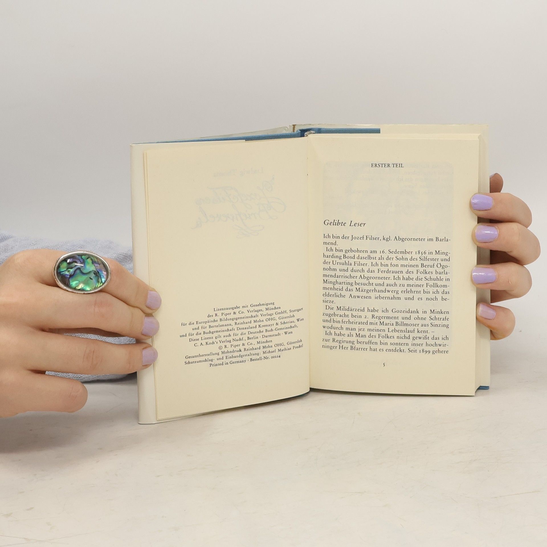 Ludwig Thoma: Jozef Filsers Briefwexel. Briefwechsel eines bayrischen Landtagsabgeordneten Erstes und zweites Buch Briefwechsel eines bayrischen Landtagsabgeordneten: Erstdruck: München (Langen) 1909. Jozef Filsers Briefwexel. Zweites Buch: Erstdruck: München (Langen) 1912. Vollständige Neuausgabe mit einer Biographie des Autors. Herausgegeben von Karl-Maria Guth. Berlin 2015. Textgrundlage ist die Ausgabe: Ludwig Thoma: Gesammelte Werke in sechs Bänden. Erweiterte Neuausgabe. Textredaktion: Albrecht Knaus, München: Piper, 1968. Die Paginierung obiger Ausgabe wird in dieser Neuausgabe als Marginalie zeilengenau mitgeführt. Umschlaggestaltung von Thomas Schultz-Overhage unter Verwendung des Bildes: Hermann Bever, Beim Zitherspiel (Ausschnitt), 1909. Gesetzt aus Minion Pro, 11 pt.