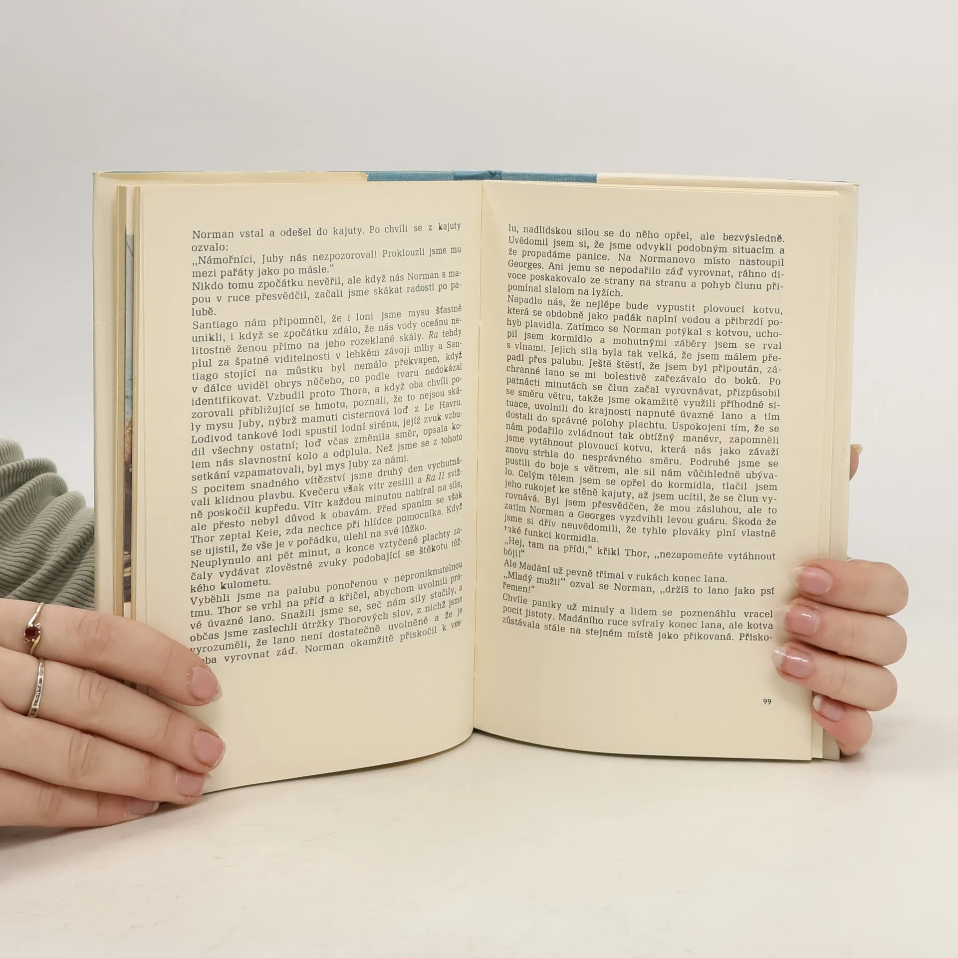 Mladý sovětský lékař Jurij Senkevič, jeden z osmi členů mezinárodní posádky, vedené norským cestovatelem a etnografem Thorem Heyerdahlem, vypráví v poutavě psané knížce o plavbě papyrusového voru z marockého přístavu Sáfí k břehům Jižní Ameriky. Živě líčí přípravy k vyplutí, denní život na lodi i četná dobrodružství, která voru připravil Atlantský oceán. Jádrem knihy nejsou Heyerdahlovy vědecké teorie ani výsledky jednotlivých expedic - ty tvoří jen rámec vyprávění. Na prvním místě jsou lidé, jejich chování a psychologie ve zvláštních podmínkách života na moři, protože Senkevič zůstává i na moři víc psychologem než mořeplavcem. 2. vydání.