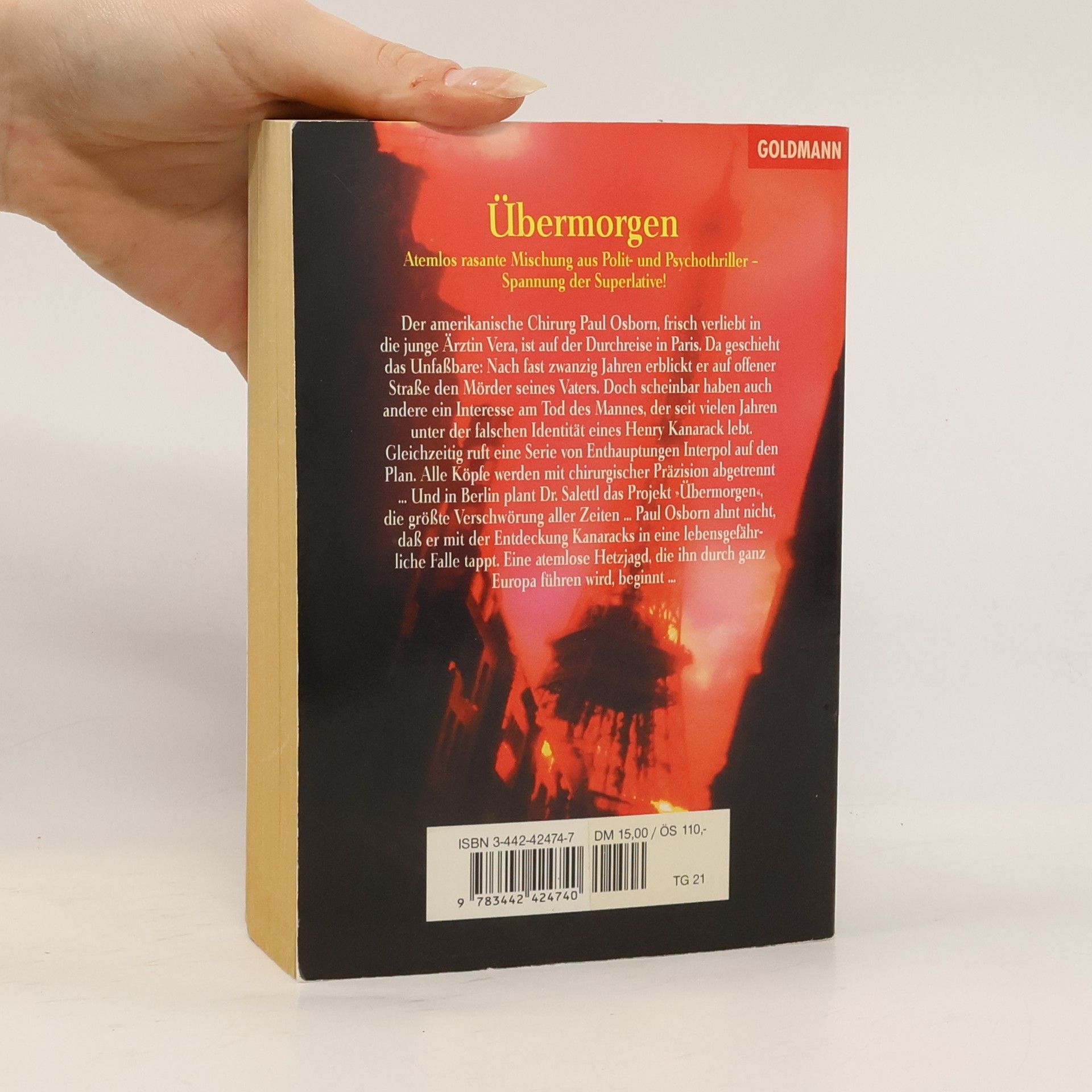 Nach fast zwanzig Jahren erblickt der amerikanische Chirurg Paul Osborn in Paris, auf offener Straße, den Mörder seines Vaters. Doch scheinbar haben auch andere ein Interesse am Tod des Mannes, der seit vielen Jahren unter der falschen Identität eines Henry Kanarack lebt. Gleichzeitig ruft eine Serie von Enthauptungen, bei denen Köpfe mit chirurgischer Präzision abgetrennt werden, Interpol auf den Plan ... Und in Berlin plant Dr. Saletti das Projekt "Übermorgen", die größte Verschwörung aller Zeiten. Paul Osborn tappt mit seiner Entdeckung Kanaracks in eine lebensgefährliche Falle. Eine atemlose Hetzjagd, die ihn durch ganz Europa führen wird, beginnt ..