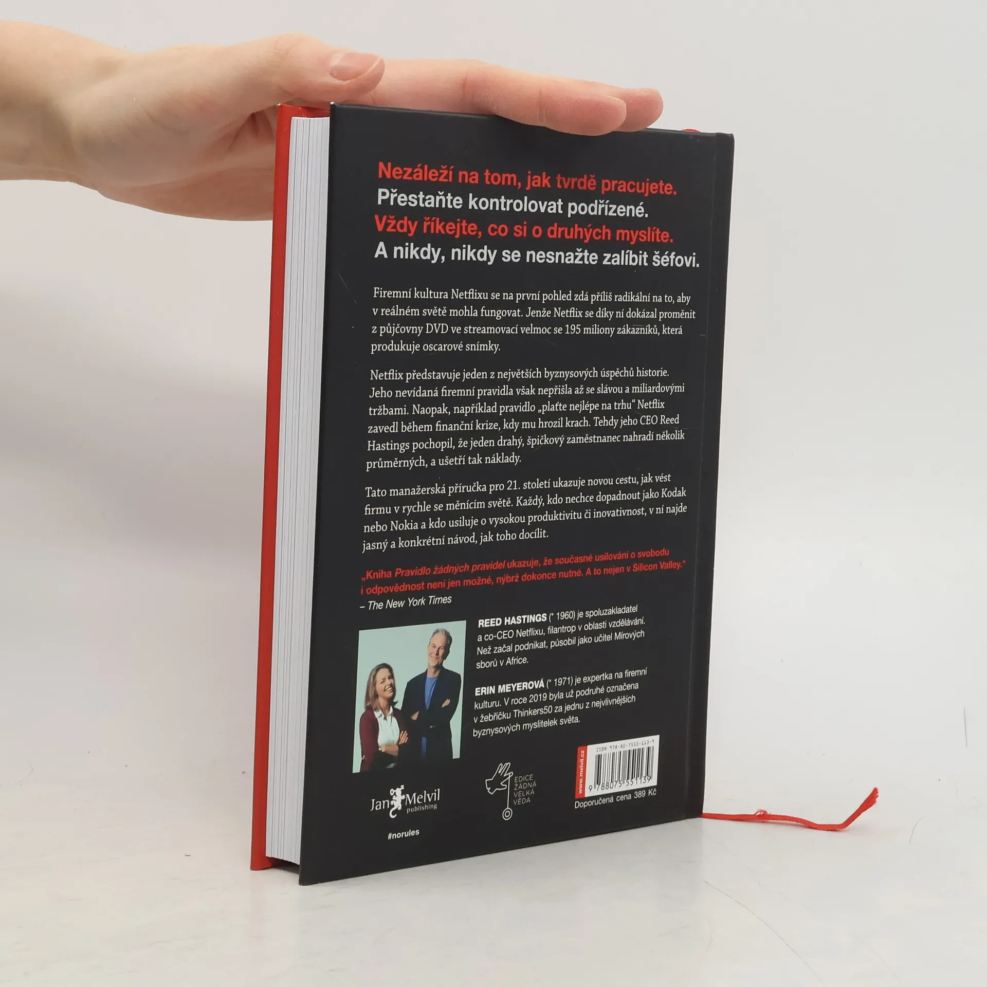 „Než přišel Netflix, nikdy předtím neexistovala společnost jako Netflix.“ Tato revoluční firma generuje miliardové roční příjmy a oslovuje stovky milionů lidí ve více než 190 zemích. Klíčovým faktorem úspěchu je kultura nastavená Reedem Hastingsem, která může na první pohled působit radikálně. Díky této kultuře zaměřené na svobodu a odpovědnost se Netflix dostal na vrchol. V tomto světovém bestselleru spoluzakladatel Hastings odhaluje vnitřní fungování Netflixu: jak nastavuje nové standardy, váží si lidí více než procesů, upřednostňuje inovace před efektivitou a zaměstnance nekontroluje. Neexistují žádná pravidla pro dovolenou ani výdaje. Zaměstnanci se nesnaží potěšit své nadřízené, ale poskytují upřímnou zpětnou vazbu. Tyto neobvyklé metody vedly k bezkonkurenční rychlosti inovací a Netflix se stal jednou z nejoblíbenějších značek na světě. Tato kniha je výbornou a čtivou byznysovou příručkou, která dramaticky proplétá historii Netflixu. Je určena pro ty, kdo vedou týmy, firmy, budují startupy nebo pracují v organizacích, které chtějí zlepšovat.