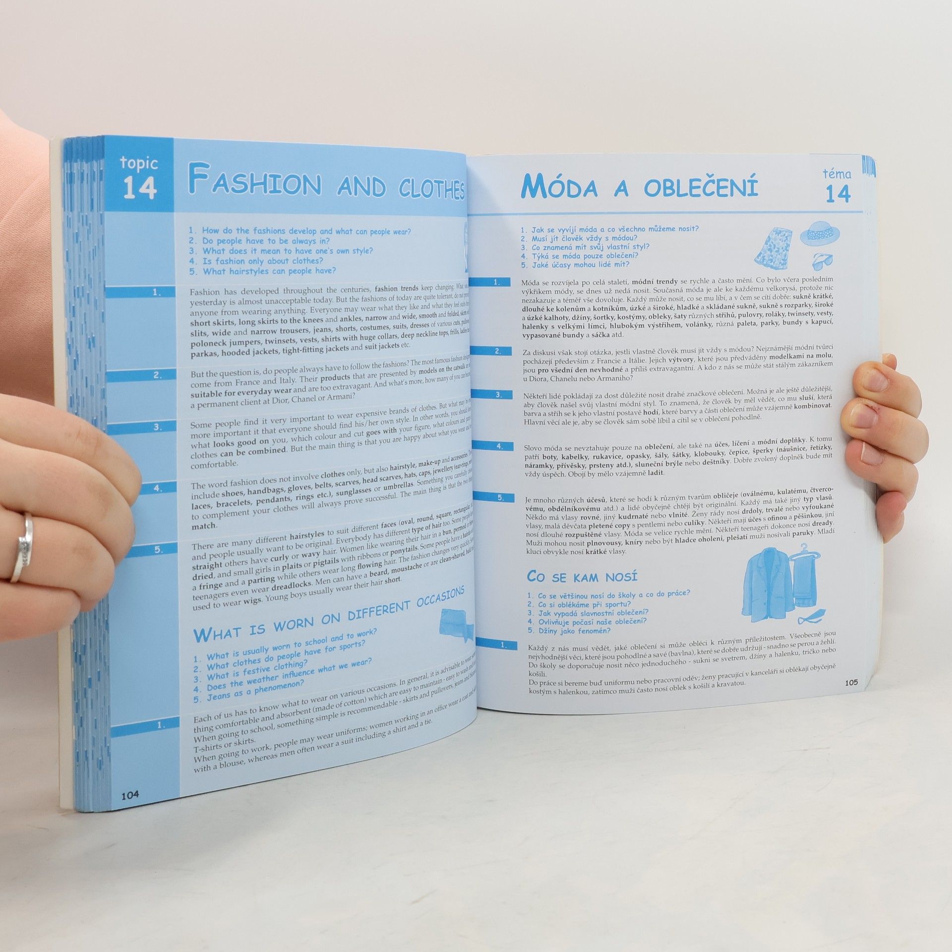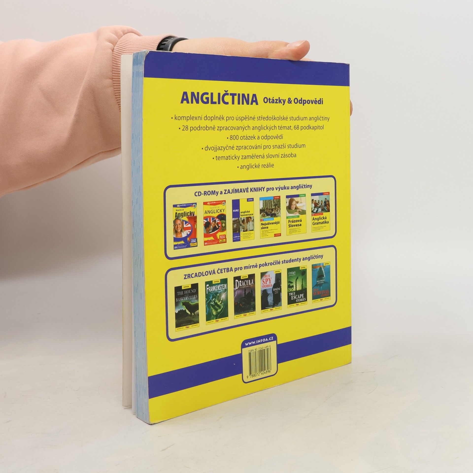 Komplexní doplněk pro úspěšné stredoškolské studium angličtiny, 28 podrobně zpracovaných témat, 68 podkapitol, 800 otázek a odpovědí, dvojjazyčné zpracování pro snazší studium, tematicky zaměřená slovní zásoba, reálie anglicky mluvících zemí, nahrávka anglických textů namluvená rodilými mluvčími V knize najdete podrobně zpracovaná témata: Rodinný život, Bydlení, Denní režim, Volný čas a zábava, Dnešní mládež, Škola a vzdělání, Volba povolání, Životopis, Pokrmy, Nakupování, Služby, Sport, Cestování, Zdraví a nemoci, Svátky, Móda a oblečení, Počasí a příroda, Umění a kultura, Média, Věda a technika, Evropská unie, Česká republika, Praha atd. Z anglických reálií témata: Spojené království Velké Británie a Severního Irska, Londýn, Spojené státy americké, Washington D. C. a jiná města v USA, Britské společenství, Anglická a americká literatura, Anglický jazyk