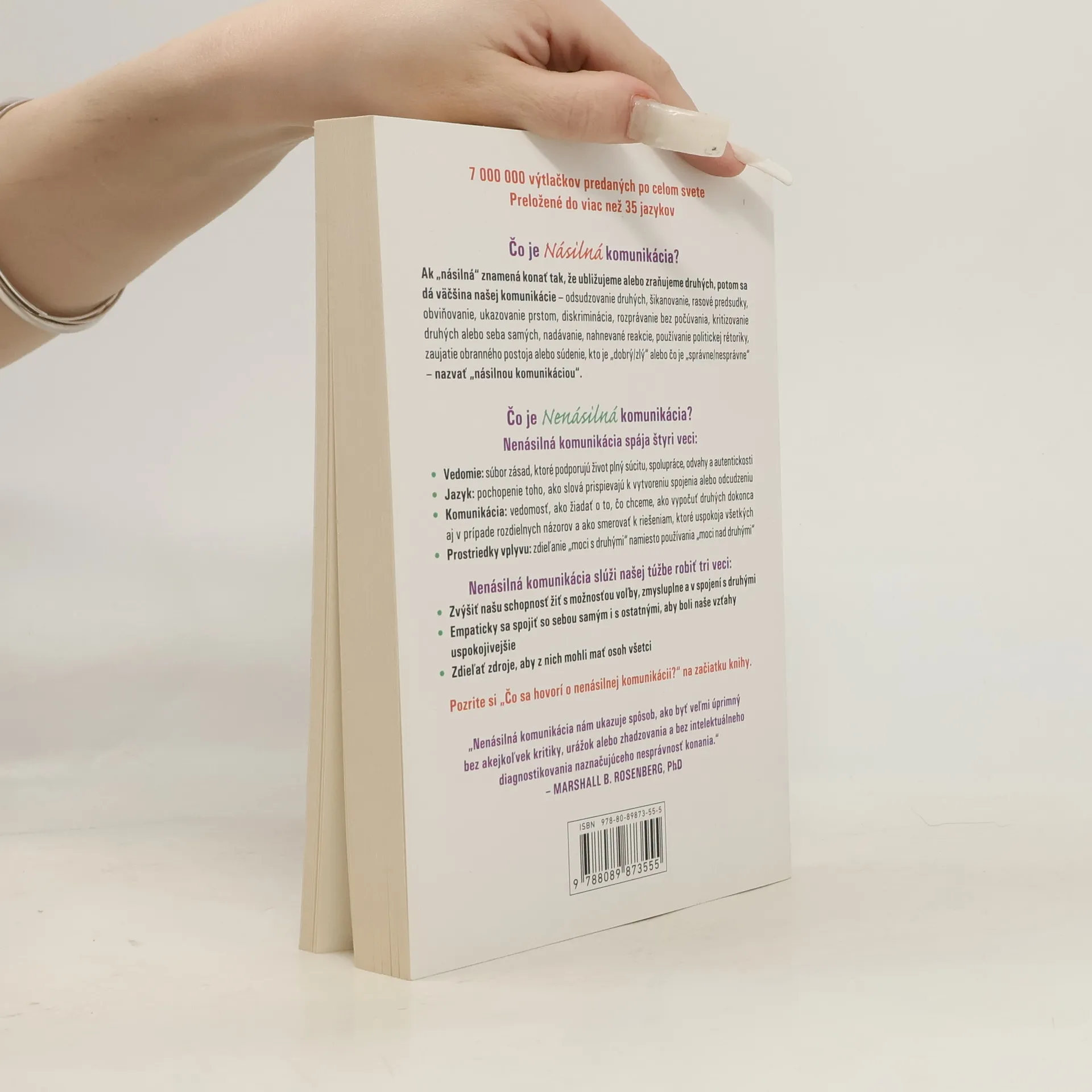Preložené do viac než 35 jazykov a s viac ako 7 miliónmi predaných výtlačkov, táto kniha sa zaoberá konceptom násilnej a nenásilnej komunikácie. Násilná komunikácia zahŕňa správanie, ktoré ubližuje druhým, ako sú odsudzovanie, šikanovanie, obviňovanie a kritizovanie. Tieto formy komunikácie vedú k rozdeleniu a nedorozumeniam. Naopak, nenásilná komunikácia spája štyri kľúčové prvky: vedomie, jazyk, komunikáciu a prostriedky vplyvu. Vedomie predstavuje zásady, ktoré podporujú súcit a spoluprácu. Jazyk sa zameriava na to, ako slová ovplyvňujú naše vzťahy. Komunikácia zahŕňa schopnosť žiadať o to, čo chceme, a počúvať druhých, aj keď máme odlišné názory. Prostriedky vplyvu sa zameriavajú na zdieľanie moci s ostatnými, namiesto jej využívania voči nim. Nenásilná komunikácia nám pomáha žiť s väčšou voľbou a zmysluplne sa spojiť s ostatnými, čím zlepšuje naše vzťahy. Ukazuje nám, ako byť úprimní bez kritiky a urážok, a ponúka cenné nástroje na dosiahnutie harmónie a porozumenia.