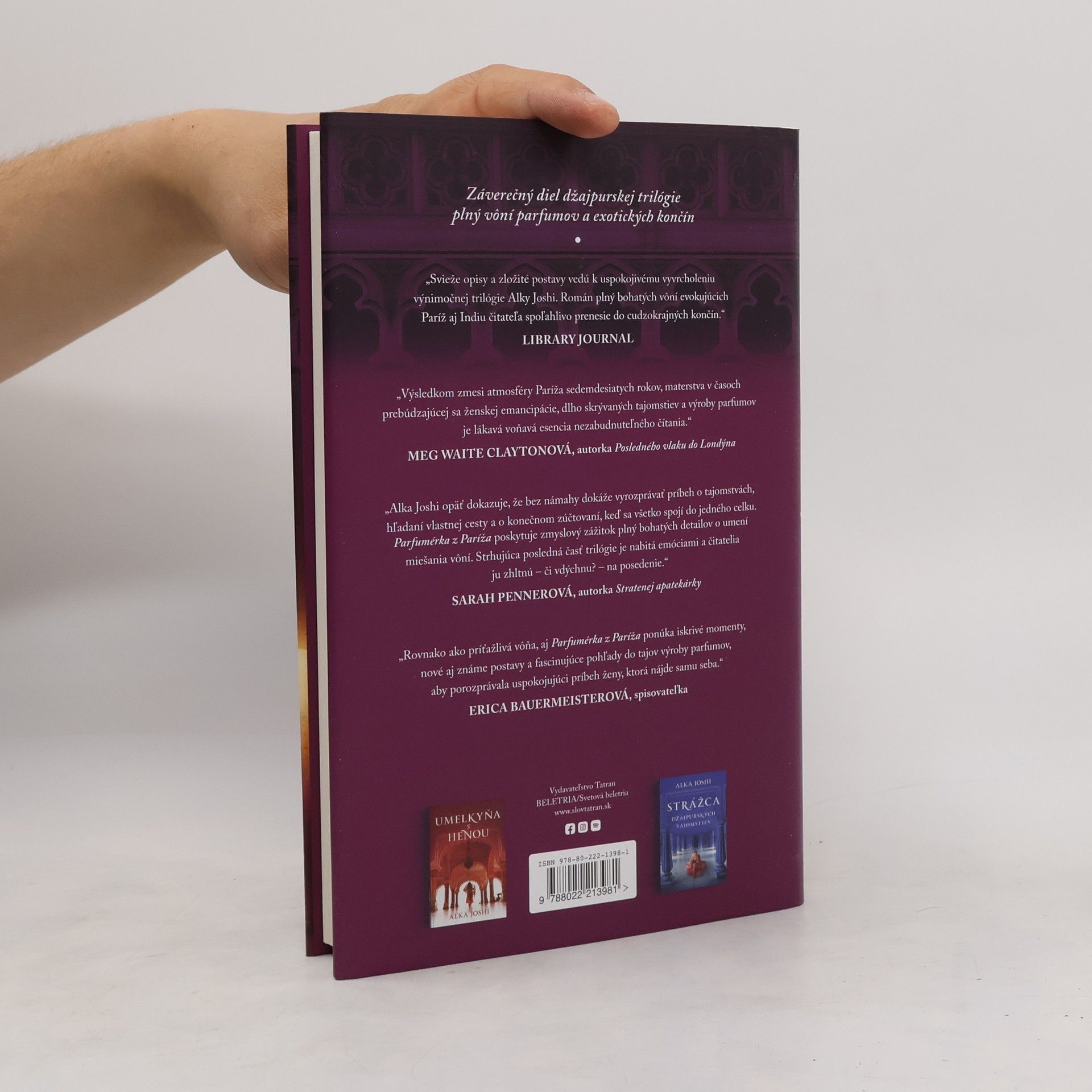 Záverečná časť Džajpurskej trilógie. Paríž 1974. Radha žije v Paríži so svojím manželom Pierrom a s dvomi dcérami. Stále smúti za synčekom, ktorého sa pred rokmi vzdala, pretože sama bola vtedy len dieťa. Dcéry vrúcne miluje a navyše objavila svoju vášeň pre vône. Pracuje pre majstraparfuméra, ktorému pomáha s návrhom vôní. K šťastiu jej chýba len to, aby Pierre pochopil jej potrebu pracovať. Vníma jeho frustráciu, no nedokáže sa vzdať práce. Keď ju majster poverí prvým veľkým projektom, odcestuje do Indie a požiada o pomoc svoju sestru Lakšmí aj kurtizány z Agra, ktoré využívajú na zvádzanie a dráždenie omamné vône. Popri práci zistí, že jej syn, o ktorom jej manžel nič netuší, sa vybral do Paríža, aby ju tam našiel. Hrozí, že úplne zničí jej starostlivo vybudovaný bezpečný svet... V Džajpurskej trilógii (Umelkyňa s henou a Strážca džajpurských tajomstiev) Alka Joshi čarovne zachytila atmosféru Indie na pozadí zaujímavých a pútavých príbehov. Svet plných intríg, úkladného plánovania a ohovárania, ale aj prírodného liečiteľstva, starých tradícií a vplyvov západu predstavuje vzrušujúce exotické čítanie.