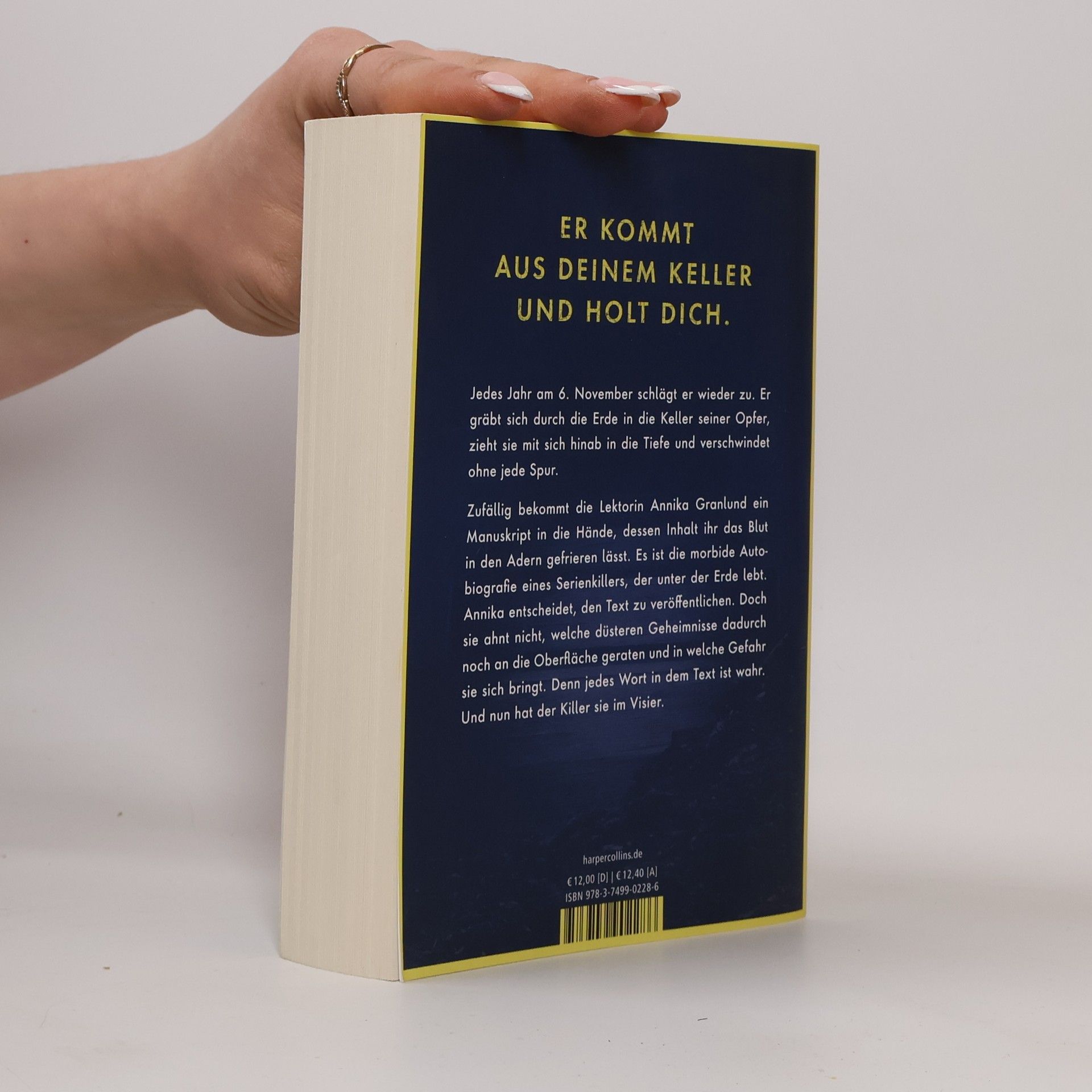 Jedes Jahr am 6. November schlägt er wieder zu. Er gräbt sich durch die Erde in die Keller seiner Opfer, zieht sie mit sich hinab in die Tiefe und verschwindet ohne jede Spur. Zufällig bekommt die Lektorin Annika Granlund ein Manuskript in die Hände, dessen Inhalt ihr das Blut in den Adern gefrieren lässt. Es ist die morbide Autobiografie eines Serienkillers, der unter der Erde lebt. Annika entscheidet, den Text zu veröffentlichen. Doch sie ahnt nicht, welche düsteren Geheimnisse dadurch noch an die Oberfläche geraten und in welche Gefahr sie sich bringt. Denn jedes Wort in dem Text ist wahr. Und nun hat der Killer sie im Visier. »Unheimlich und spannend – die Jagd nach dem Mörder ist fesselnd.« Radio Euroherz