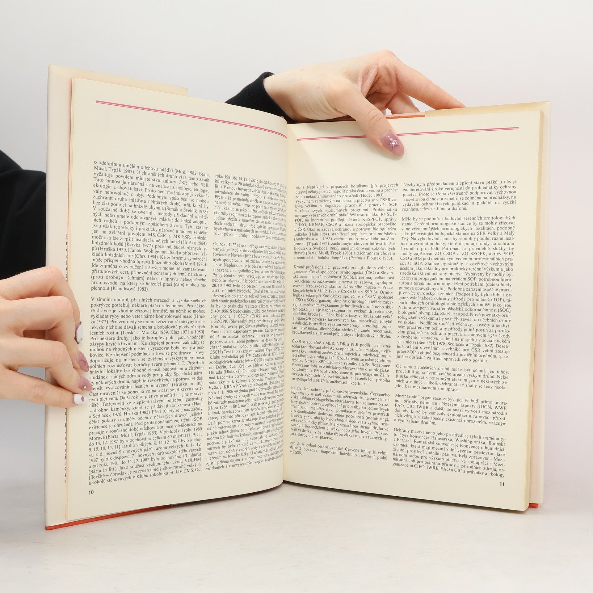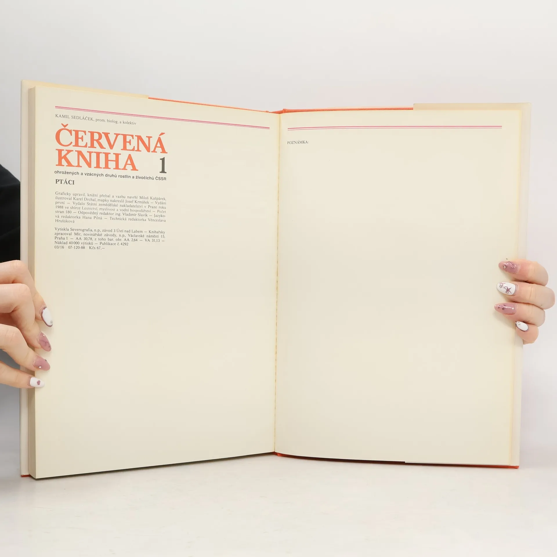1. díl československé Červené knihy – Ptáci zahrnuje 143 ohrožených druhů. Autoři nás podrobně seznamují nejen s kritérii, podle kterých se ptáci do červených seznamů zařazují, ale i s ochranou ptactva v ČSSR vůbec – v knize jsou kapitoly o její minulosti, nynějším stavu i o výhledech do budoucnosti. Cenný je rozsáhlý seznam literatury, kterým se vychází vstříc zájemcům o hlubší znalost problematiky.