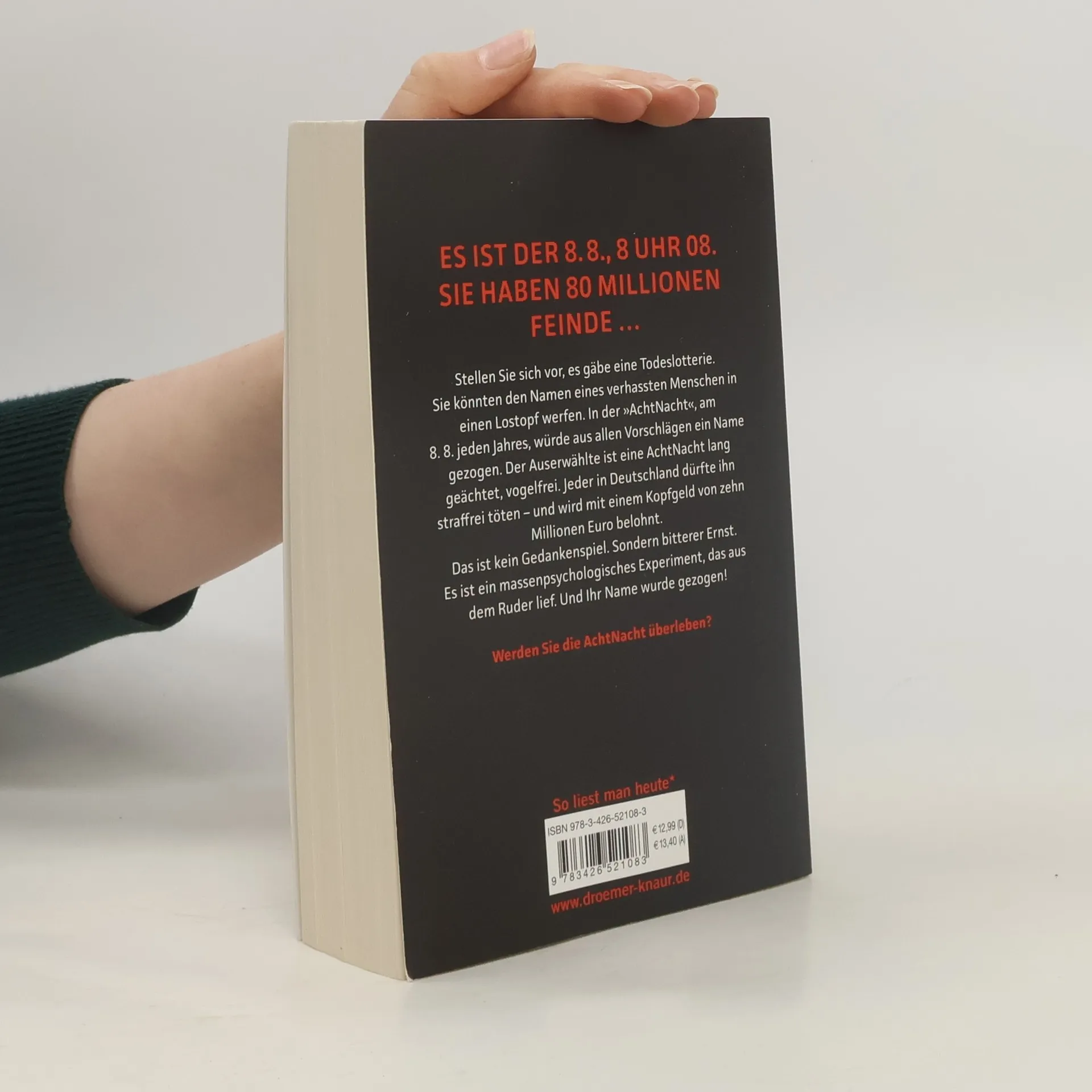 Ein furioser Thriller von Sebastian Fitzek, basierend auf einer großartigen Wahn-Idee: Was wäre, wenn du einen Menschen deiner Wahl straflos töten darfst? Es ist der 8. 8., acht Uhr acht. Du hast 80 Millionen Feinde. Wirst du die AchtNacht überleben? Stell dir vor, es gibt eine Todeslotterie. Du kannst den Namen eines verhassten Menschen in einen Lostopf werfen. In der „AchtNacht“, am 8. 8. jedes Jahres, wird aus allen Vorschlägen ein Name gezogen. Der Auserwählte ist eine AchtNacht lang geächtet, vogelfrei. Jeder in Deutschland darf ihn straffrei töten - und wird mit einem Kopfgeld von zehn Millionen Euro belohnt. Das ist kein Gedankenspiel. Sondern bitterer Ernst. Es ist ein massen-psychologisches Experiment, das aus dem Ruder lief. Und dein Name wurde gezogen! Ein rasanter Action-Thriller und Bestseller von Sebastian Fitzek, dem „Meister des Wahns“ – exklusiv im Taschenbuch.