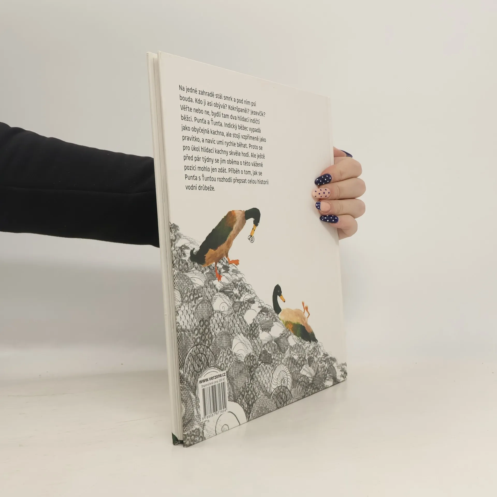 Na jedné zahradě stál smrk a pod ním psí bouda. Kdo ji asi obývá? Kokršpaněl? Jezevčík? Věřte nebo ne, bydlí tam dva hlídací indičtí běžci. Punťa a Ťunťa. Indický běžec vypadá jako obyčejná kachna, ale stojí vzpřímeně jako pravítko, a navíc umí rychle běhat. Proto se pro úkol hlídací kachny skvěle hodí. Ale ještě před pár týdny se jim oběma o této vážené pozici mohlo jen zdát. Příběh o tom, jak se Punťa s Ťunťou rozhodli přepsat celou historii vodní drůbeže. Autorská kniha vznikla původně jako bakalářská práce na Fakultě designu a umění Ladislava Sutnara Západočeské univerzity v Plzni.