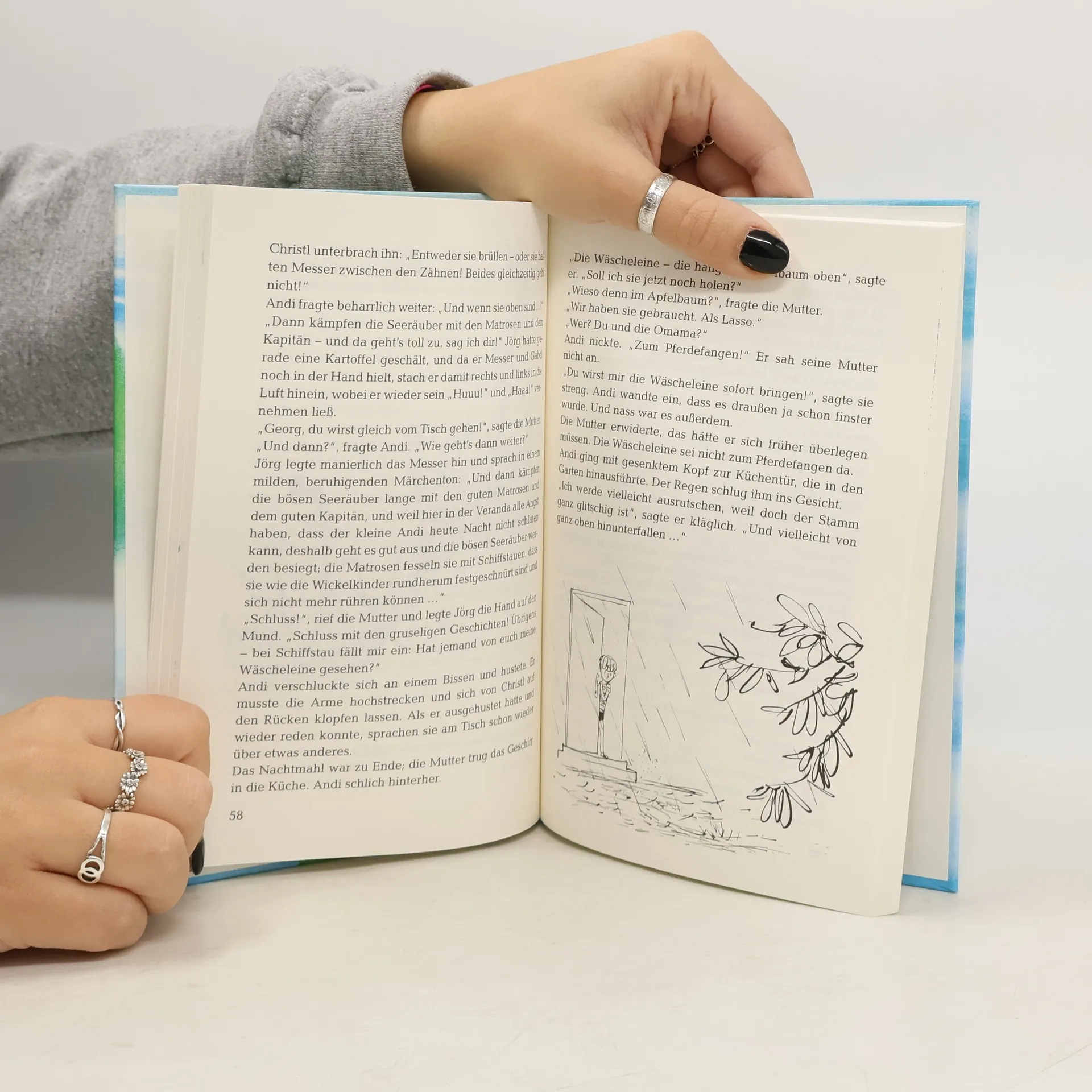 Andi ist traurig, weil ausgerechnet er keine Oma hat. Und dann sind es plötzlich zwei: eine, die sein Versteck im Apfelbaum kennt, und mit der er die tollsten Abenteuer erlebt. Sie fährt ein himmelblaues Auto und reitet auf einem Tiger nach Indien. Die zweite Oma backt ihm Zwetschkenkuchen, ist sehr gemütlich und lässt sich von Andi gerne umsorgen.