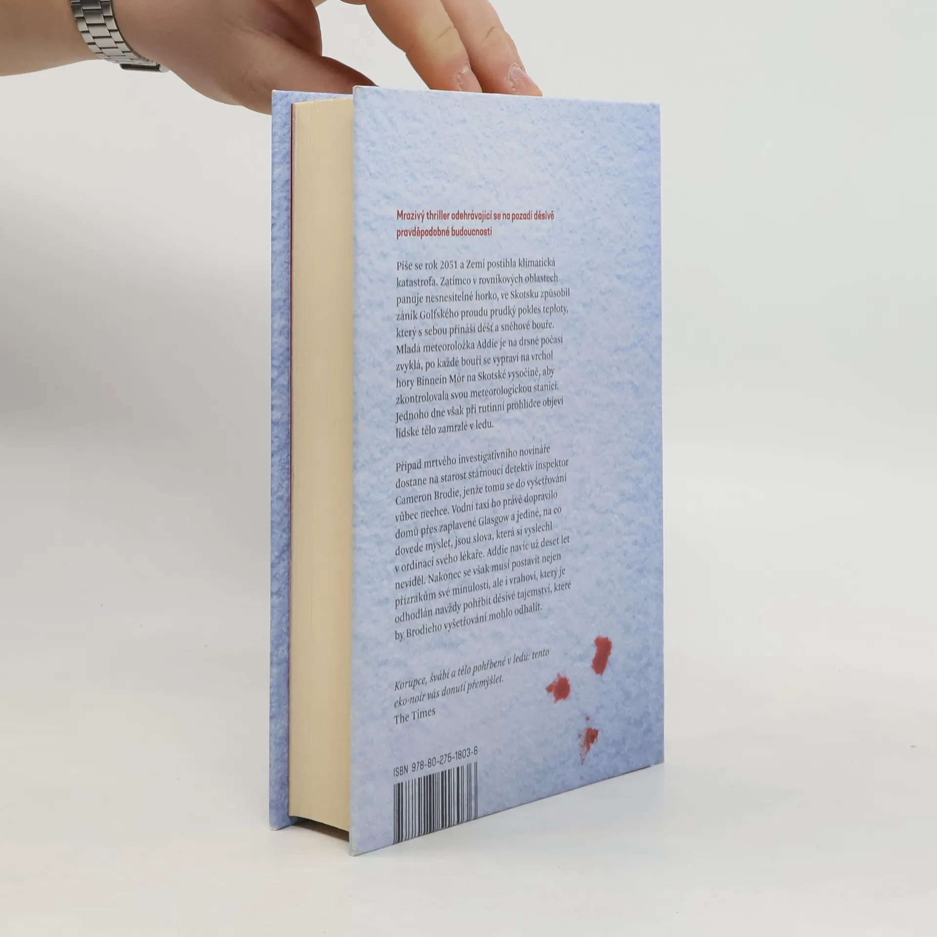 Mrazivý thriller odehrávající se na pozadí děsivě pravděpodobné budoucnosti. Píše se rok 2051 a Zemi postihla klimatická katastrofa. Zatímco v rovníkových oblastech panuje nesnesitelné horko, ve Skotsku způsobil zánik Golfského proudu prudký pokles teploty, který s sebou přináší déšť a sněhové bouře. Mladá meteoroložka Addie se po každé bouři se vypraví na vrchol hory Binnein Mňr na Skotské vysočině, aby zkontrolovala svou meteorologickou stanici. Jednoho dne však při rutinní prohlídce objeví lidské tělo zamrzlé v ledu. Případ mrtvého investigativního novináře dostane na starost stárnoucí detektiv inspektor Cameron Brodie, jenže tomu se do vyšetřování vůbec nechce. Nakonec se však musí postavit nejen přízrakům své minulosti, ale i vrahovi, který je odhodlán navždy pohřbít děsivé tajemství, které by Brodieho vyšetřování mohlo odhalit. Nakladatelská anotace. Kráceno.