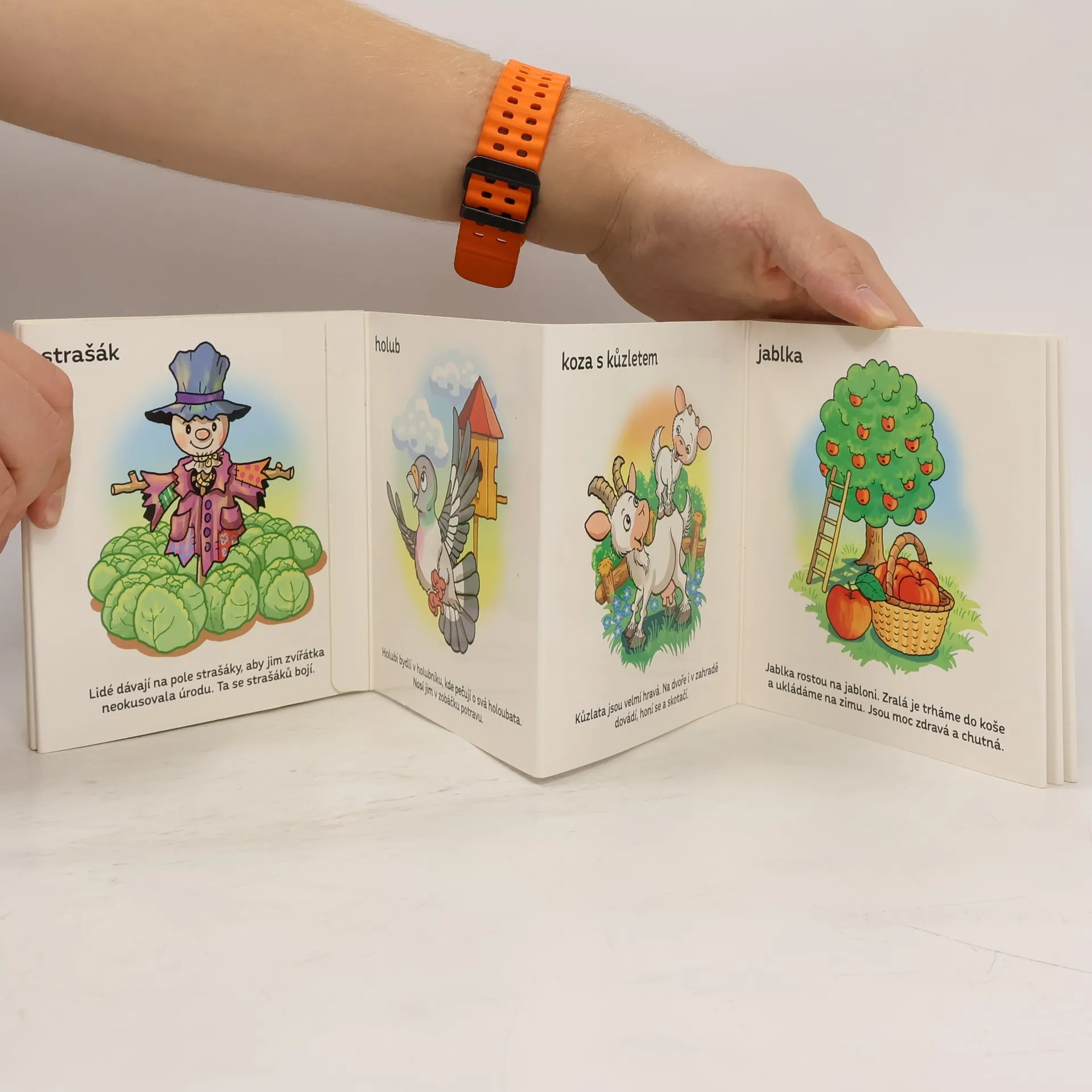 Dlouhé leporelo s veselými obrázky z farmy doplněný jednoduchým naučným popisem.