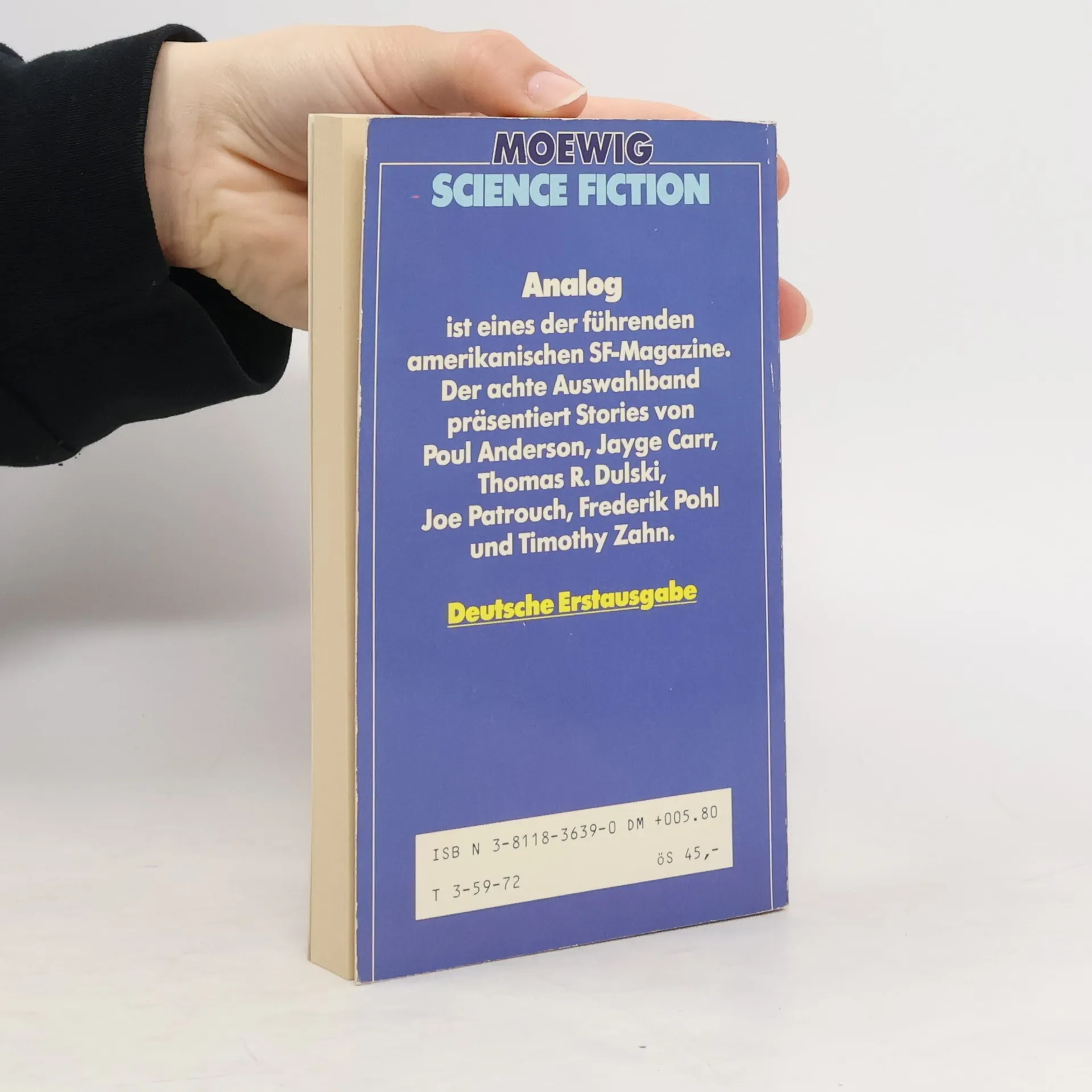 Enthält eine Auswahl von Analog-Stories aus den Jahren 1981 und 1983. Timothy Zahn - Daseinsberechtigung (Raison d'etre, Übs.: Wolfgang Crass) Jayge Carr - Der Senfsame (Mustard seed, Übs.: Michael Windgassen) Frederik Pohl - Diener des Volkes (Servant of the people, Übs.: Joachim Körber) Joe Patrouch - Den Tiger beim Schwanz packen (Tiger by the tail, Übs.: Wolfgang Crass) Timothy Zahn - Der Preis des Überlebens (The price of survival, Übs.: Ulrich Kiesow) Thomas R. Dulski - Der Trelph ist ein Einzelgänger