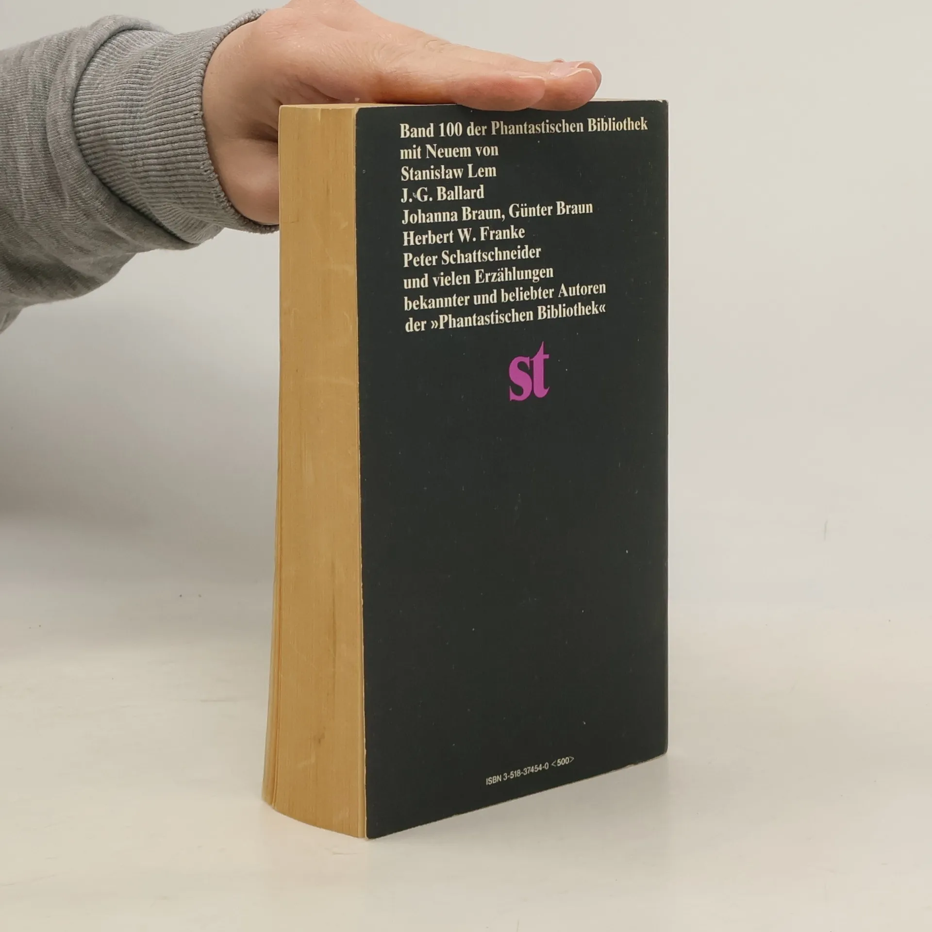 Band 100 der Phantastischen Bibliothek mit Neuen Erzählungen bekannter und beliebter Autoren der \"Phantastischen Bibliothek\" Stanislaw Lem , Die Verdopplung J.G. Ballard , Erinnerungen an das Raumfahrtzeitalter Johanna & Günter Braun , Limbdisten Herbert W. Franke , Der Atem der Sonne Peter Schattschneider , Die Jez'r Fragmente Cordwainer Smith , Das ausgebrannte Gehirn Vladimir Colin , Die letzte Verwandlung des Tristan H.P. Lovecraft , Die Farbe aus dem All Jean Ray , Der Friedhofswächter Edgar Allan Poe , William Wilson Ambrose Bierce , Einer von den Vermißten Josef Nesvadba , Die zweite Insel des Doktor Moreau Stefan Grabinski , Das Gebiet Fitz-James O'Brien , Die Diamantlinse Algernon Blackwood , Die Weiden Lord Dunsany , Der Gibbelin-Hort Bernd Ulbric h, Ein Gott hat geweint