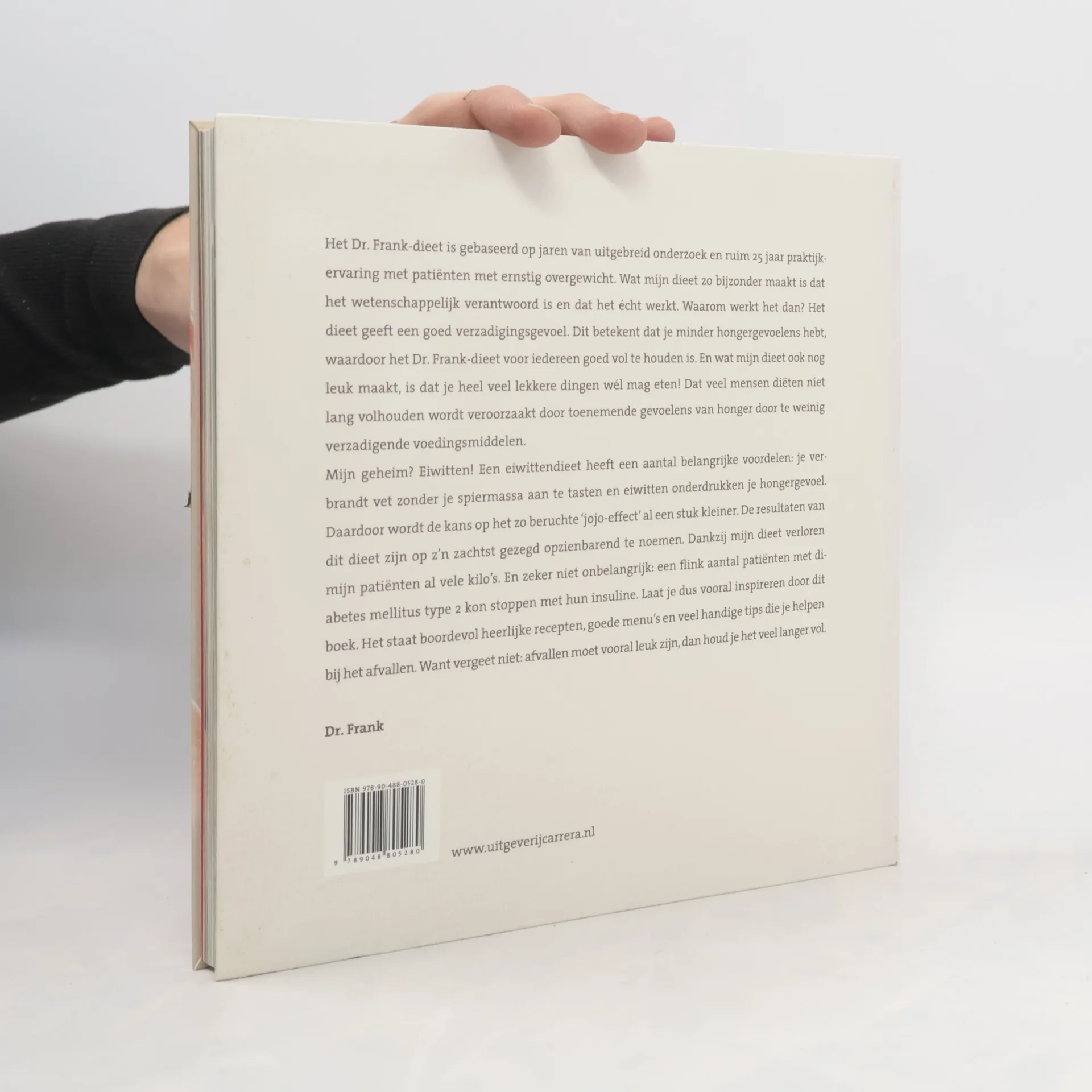Het Dr. Frank-dieet is gebaseerd op jaren van uitgebreid onderzoek en ruim 25 jaar praktijkervaring met patiënten met ernstig overgewicht. Wat mijn dieet zo bijzonder maakt is dat het wetenschappelijk verantwoord is en dat het écht werkt. Waarom werkt het dan? Het dieet geeft een goed verzadigingsgevoel. Dit betekent dat je minder hongergevoelens hebt, waardoor het Dr. Frank-dieet voor iedereen goed vol te houden is. En wat mijn dieet ook nog leuk maakt, is dat je heel veel lekkere dingen wél mag eten! Dat veel mensen diëten niet lang volhouden wordt veroorzaakt door toenemende gevoelens van honger door te weinig verzadigende voedingsmiddelen.'Mijn geheim? Eiwitten! Een eiwittendieet heeft een aantal belangrijke voordelen: je verbrandt vet zonder je spiermassa aan te tasten en eiwitten onderdrukken je hongergevoel. Daardoor wordt de kans op het zo beruchte 'jojo-effect' al een stuk kleiner. De resultaten van dit dieet zijn op z'n zachtst gezegd opzienbarend te noemen. Dankzij mijn dieet verloren mijn patiënten al vele kilo's. En zeker niet onbelangrijk: een flink aantal patiënten met diabetes mellitus type 2 kon stoppen met hun insuline. Laat je dus vooral inspireren door dit boek. Het staat boordevol heerlijke recepten, goede menu's en veel handige tips die je helpen bij het afvallen. Want vergeet niet: afvallen moet vooral leuk zijn, dan houd je het veel langer vol.'Dr. Frank