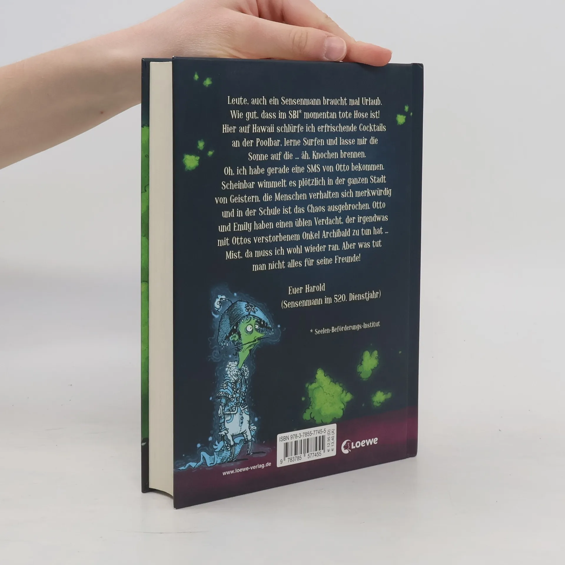 Leute, auch ein Sensenmann braucht mal Urlaub. Wie gut, dass im SBI* momentan tote Hose ist! Hier auf Hawaii schlürfe ich erfrischende Cocktails an der Poolbar, lerne Surfen und lasse mir die Sonne auf die … äh, Knochen brennen. Oh, ich habe gerade eine SMS von Otto bekommen. Scheinbar wimmelt es plötzlich in der ganzen Stadt von Geistern, die Menschen verhalten sich merkwürdig und in der Schule ist das Chaos ausgebrochen. Otto und Emily haben einen üblen Verdacht, der irgendwas mit Ottos verstorbenem Onkel Archibald zu tun hat … Mist, da muss ich wohl wieder ran. Aber was tut man nicht alles für seine Freunde! Euer Harold (Sensenmann im 520. Dienstjahr) *Seelen-Beförderungs-Institut