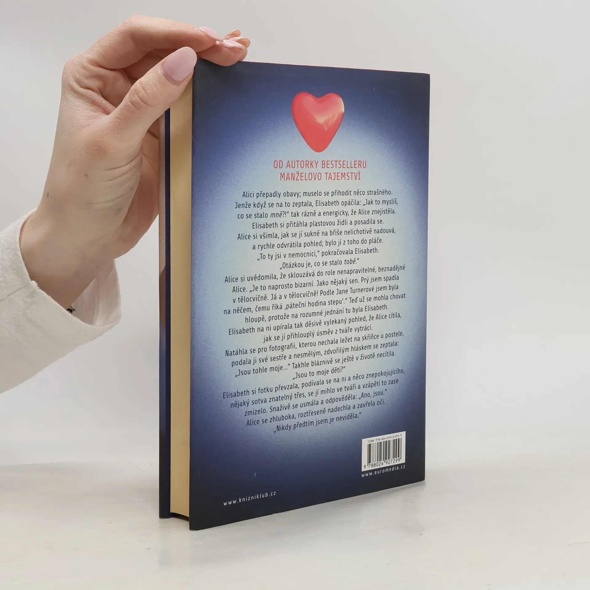Když se Alice probere na zemi v posilovně, má na hlavě pořádnou bouli a myslí si, že je jí dvacet devět a čeká první dítě se svým superúžasným manželem Nickem. Jenomže pak se dozví, že se jí z paměti právě vymazalo deset let života a že je ve skutečnosti devětatřicetiletá neurotička, která nejraději tráví svůj volný čas v posilovně nebo na poradách školního výboru se ženami, jež kdysi nesnášela. Jak se to stalo, že se její život tak radikálně změnil? Proč ji její manžel nenávidí? Co tak hrozného provedla, že s ní její milovaná sestra skoro nemluví? A do toho si není schopná vůbec vzpomenout na svoje tři děti – ne, Alice se najednou vidí jinýma očima a ta nová žena, o které jí vyprávějí, se jí vůbec nezamlouvá. Najde způsob, aby se znovu stala tím člověkem, kterým bývala?