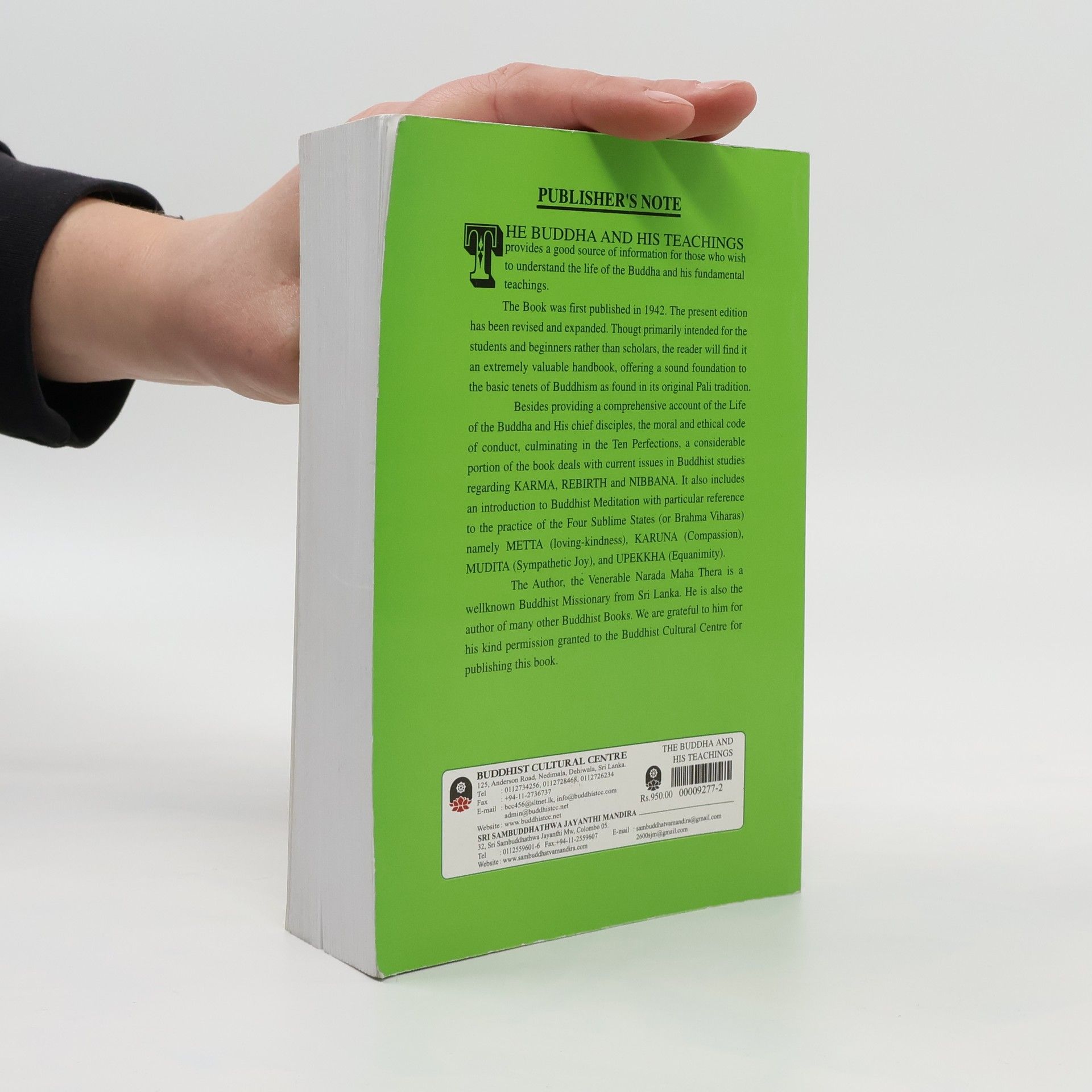 THE BUDDHA AND HIS TEACHINGS provides a good source of information for those who wish to understand the life of the Buddha and his fundamental teachings. The Book was first published in 1942. The present edition has been revised and expanded. Though primarily intended for the students and beginners rather than scholars, the reader will find it an extremely valuable handbook, offering a sound foundation to the basic tenets of Buddhism as found in its original Pali tradition. Besides providing a comprehensive account of the Life of the Buddha and His chief disciples, the moral and ethical code of conduct, culminating in the Ten Perfections, a considerable portion of the book deals with current issues in Buddhist studies regarding KARMA, REBIRTH and NIBBANA. It also includes an introduction to Buddhist Meditation with particular reference to the practise of the Four Sublime States (or Brahma Viharas) namely METTA (loving-kindness), KARUNA (Compassion), MUDITA (Sympathetic Joy), and UPEKKHA (Equanimity). The Author, the Venerable Narada Maha Thera is a well known Buddhist Missionary from Sri Lanka. He is also the author of many other Buddhist publications — well-used among students of Buddhism. We are grateful to him for his kind permission, enabling this reprint to be effected in Malaysia.